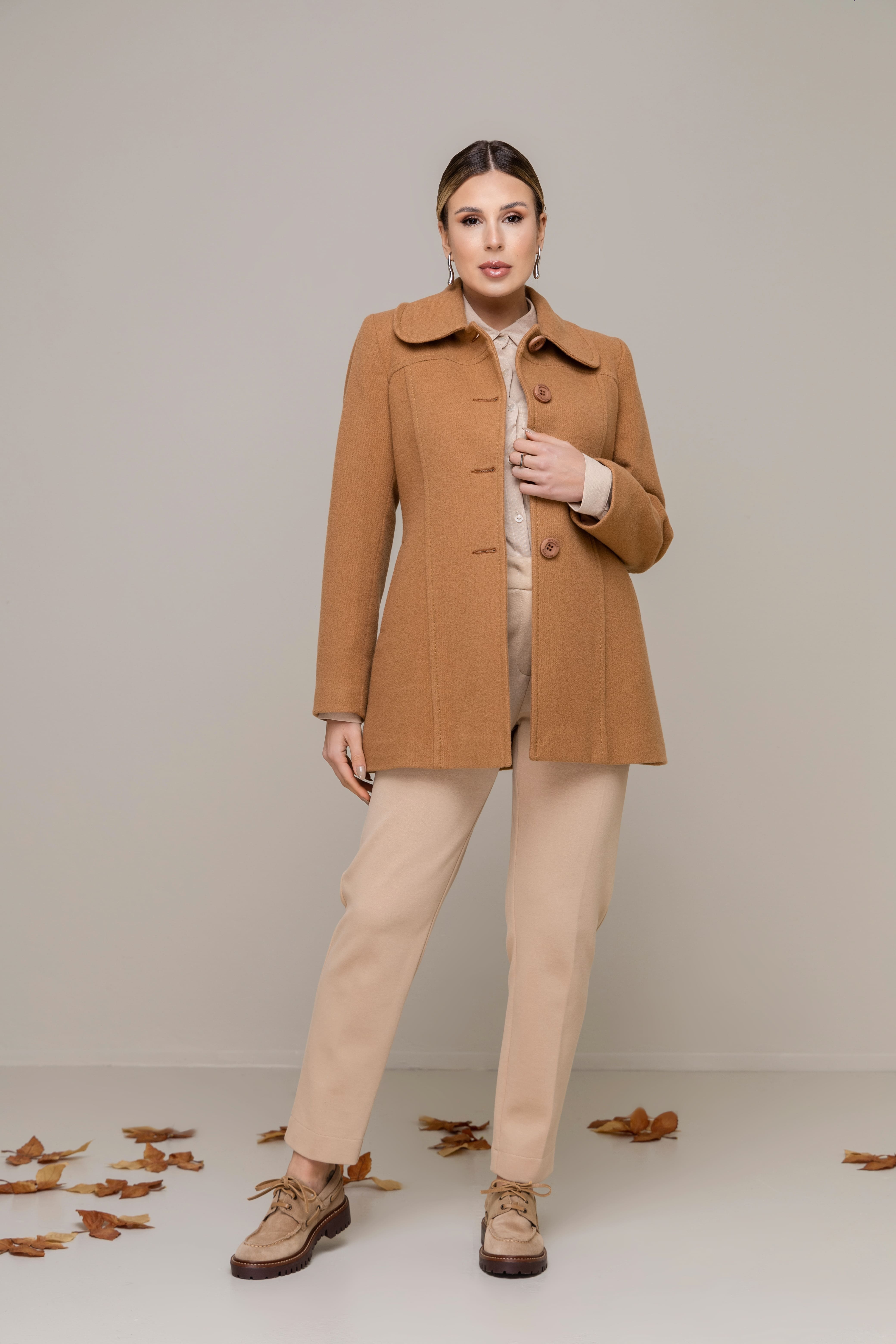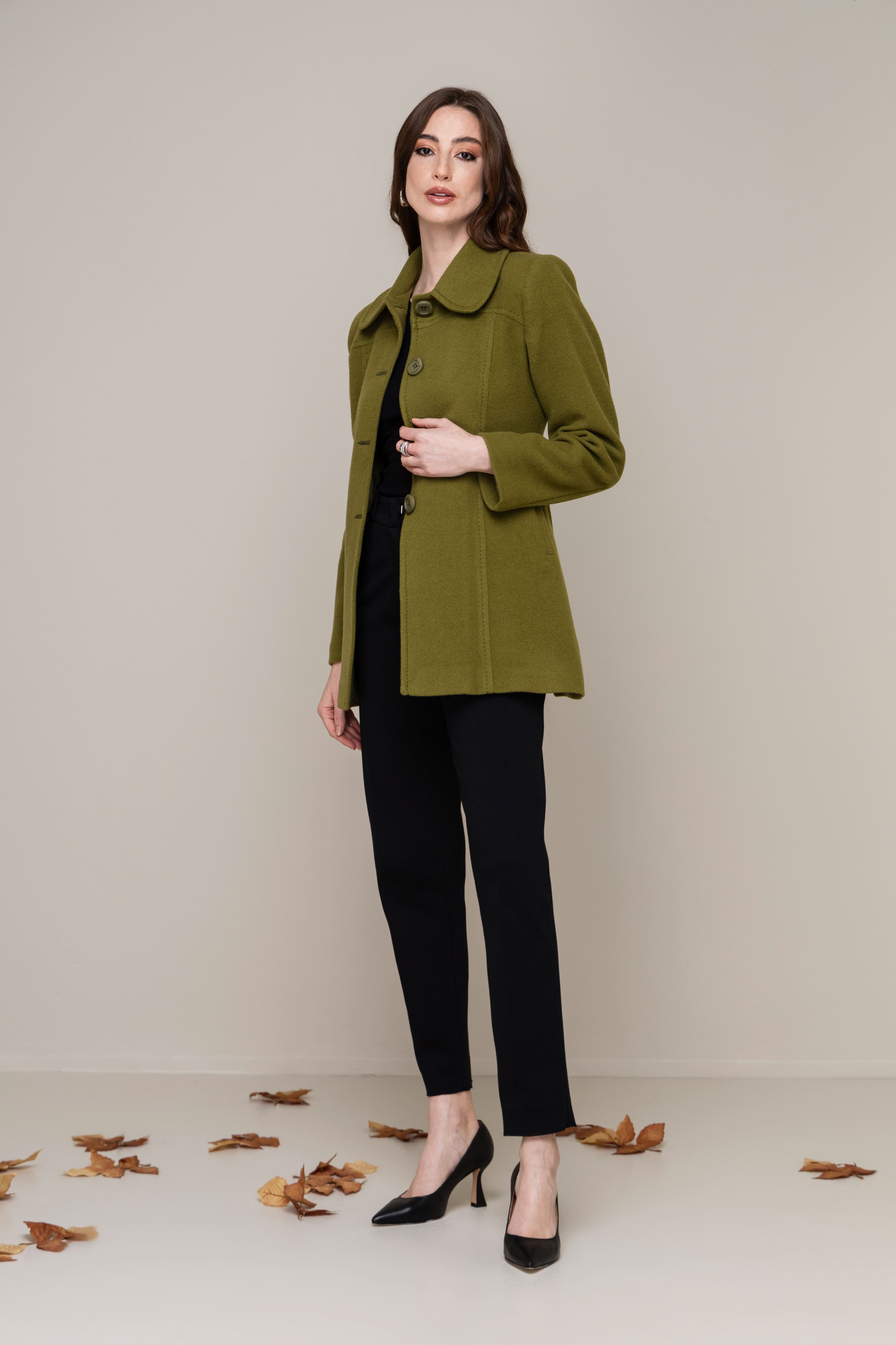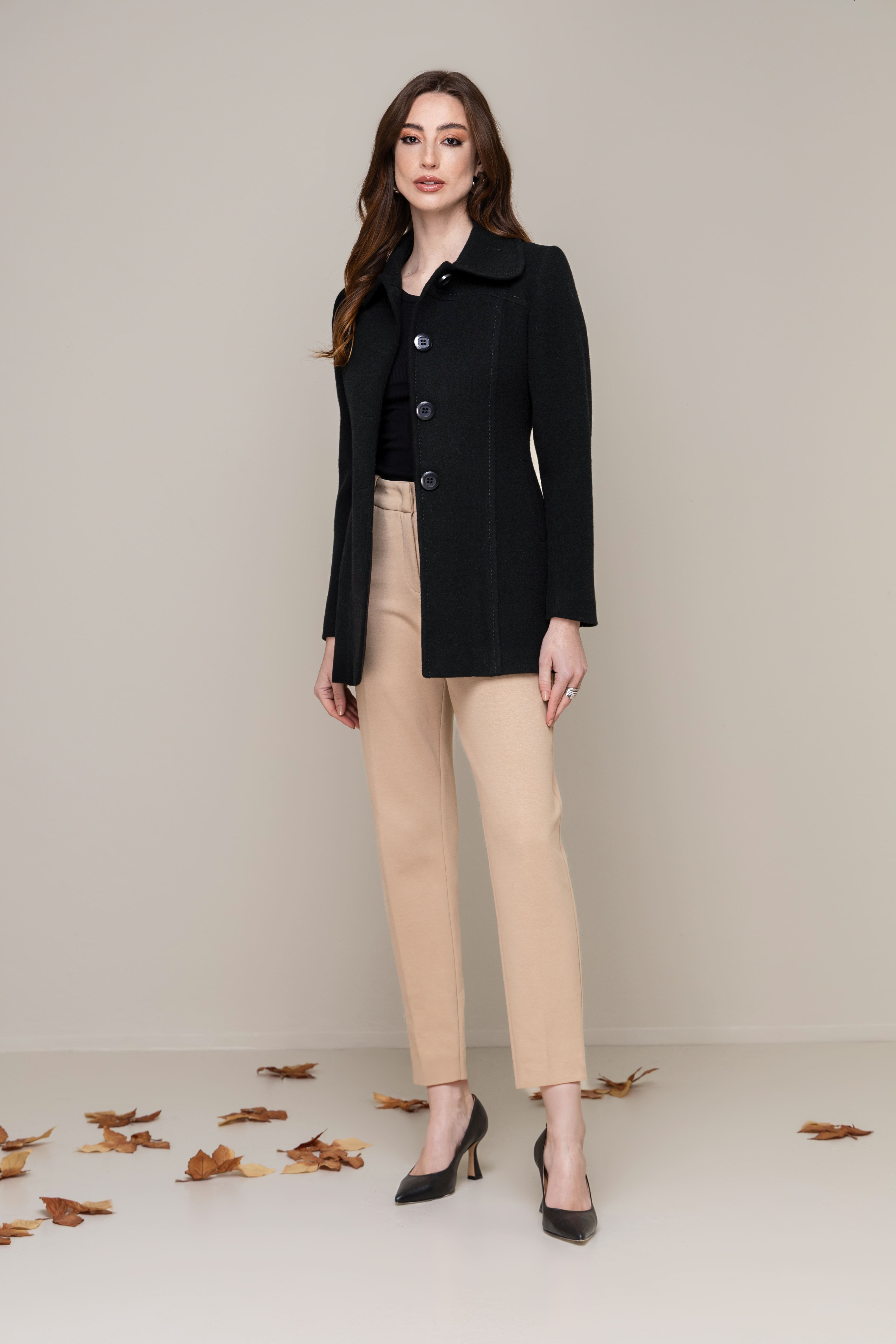 Casaco 3/4 em lã forrada, com gola arredondada, recortes estruturados e bolsos laterais discretos. Modelagem levemente acinturada e fechamento em botões.