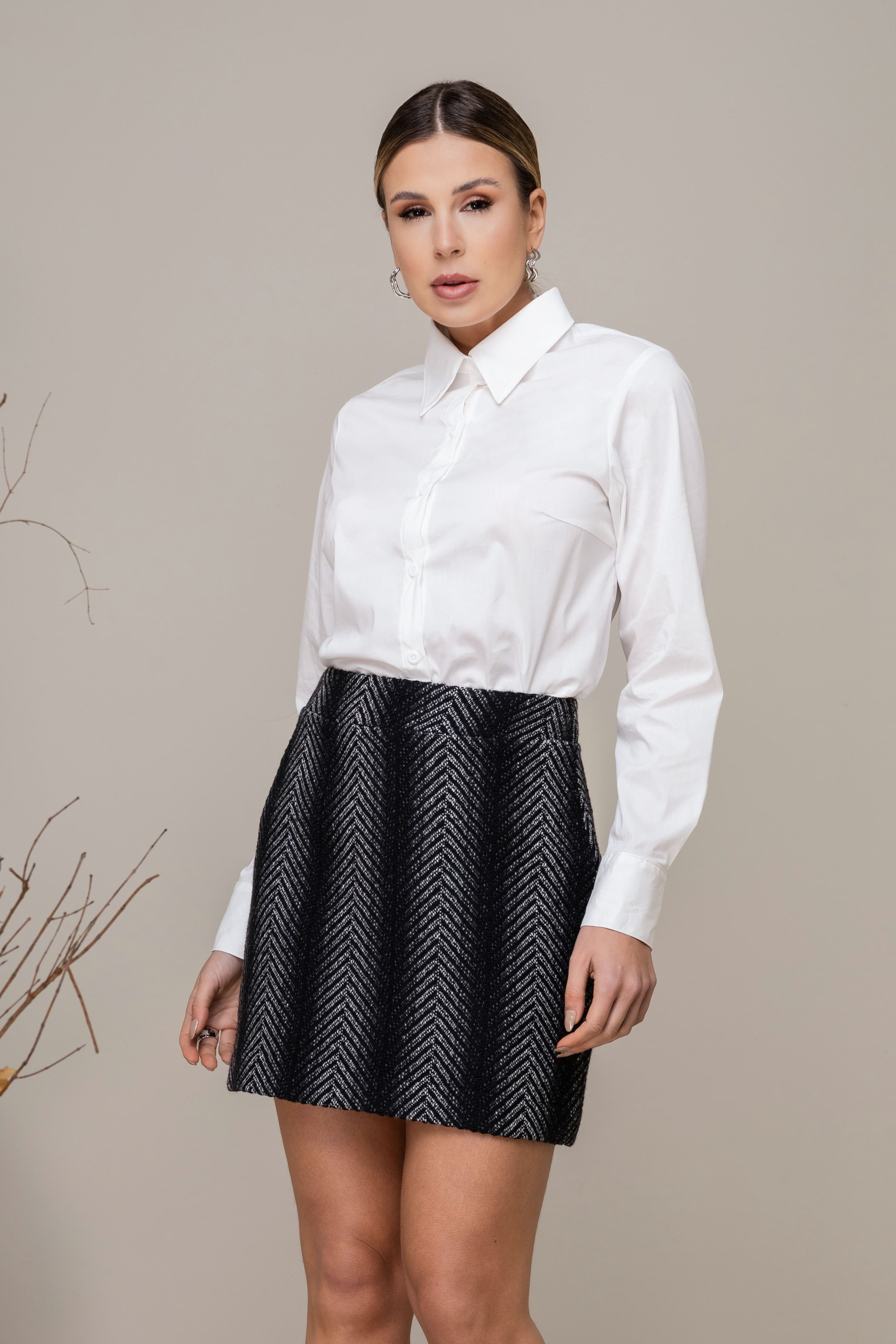 Saia clássica em lã espinha de peixe forrada, com corte reto e cós estruturado. Possui fechamento por zíper de metal nas costas.