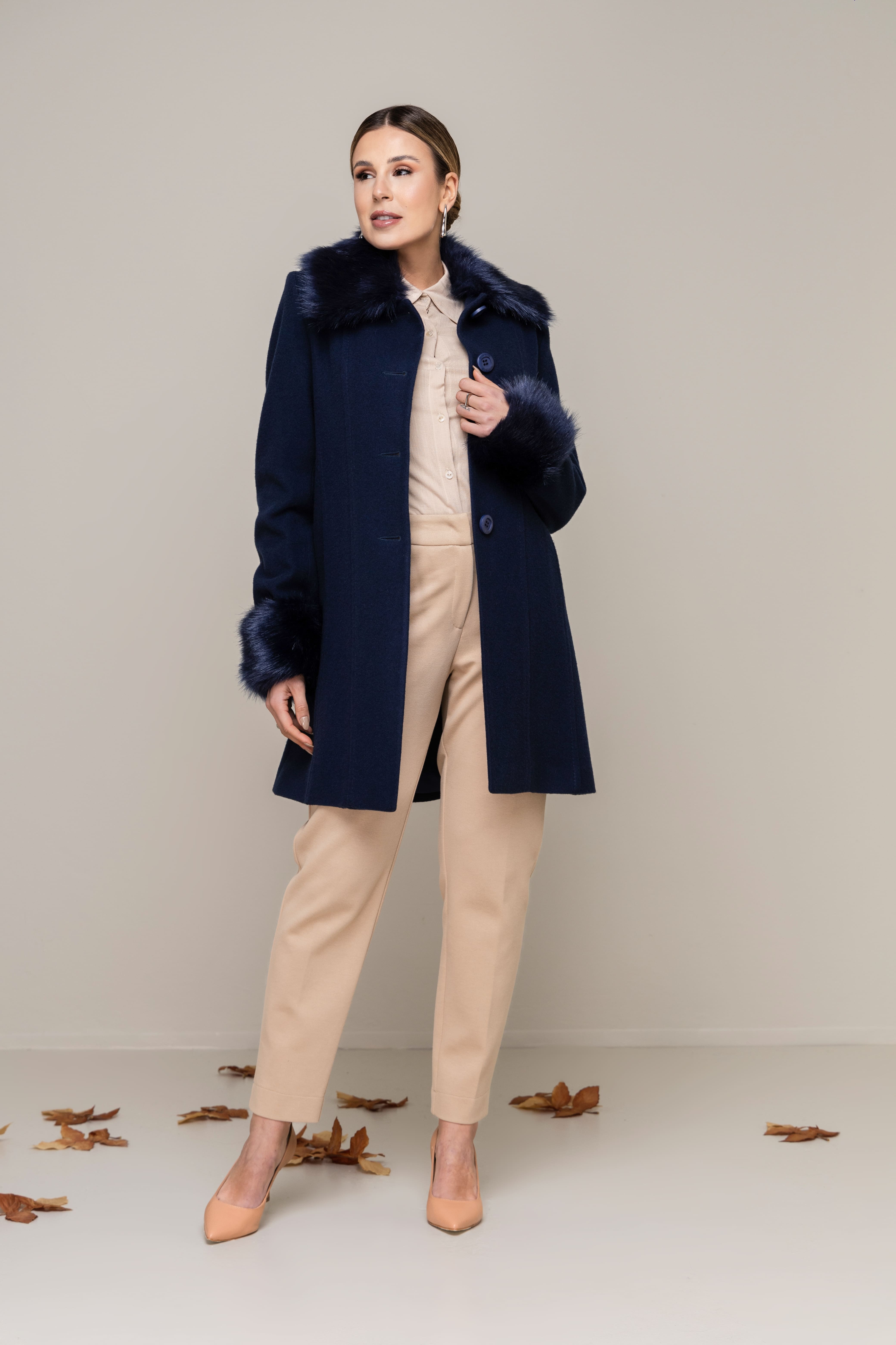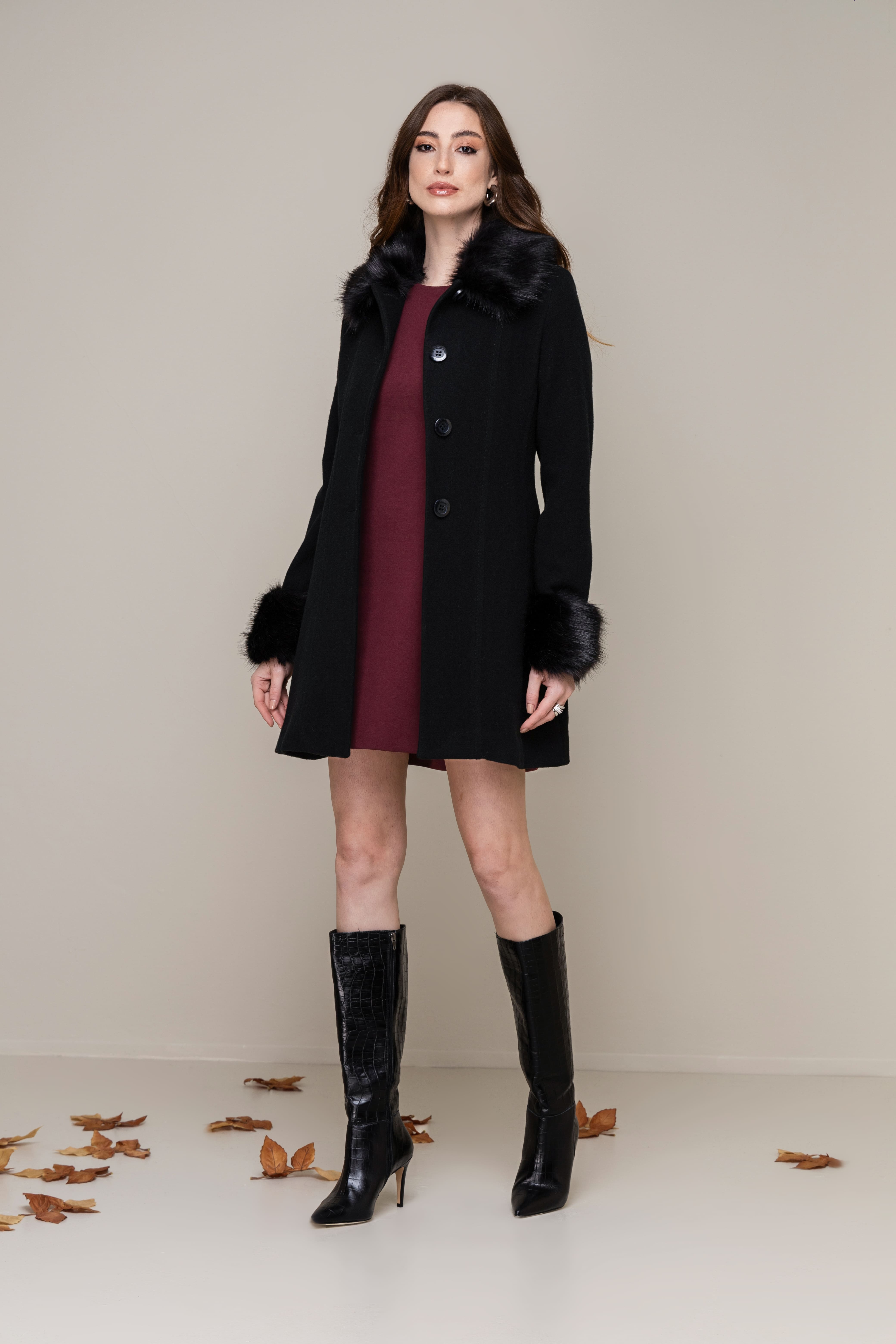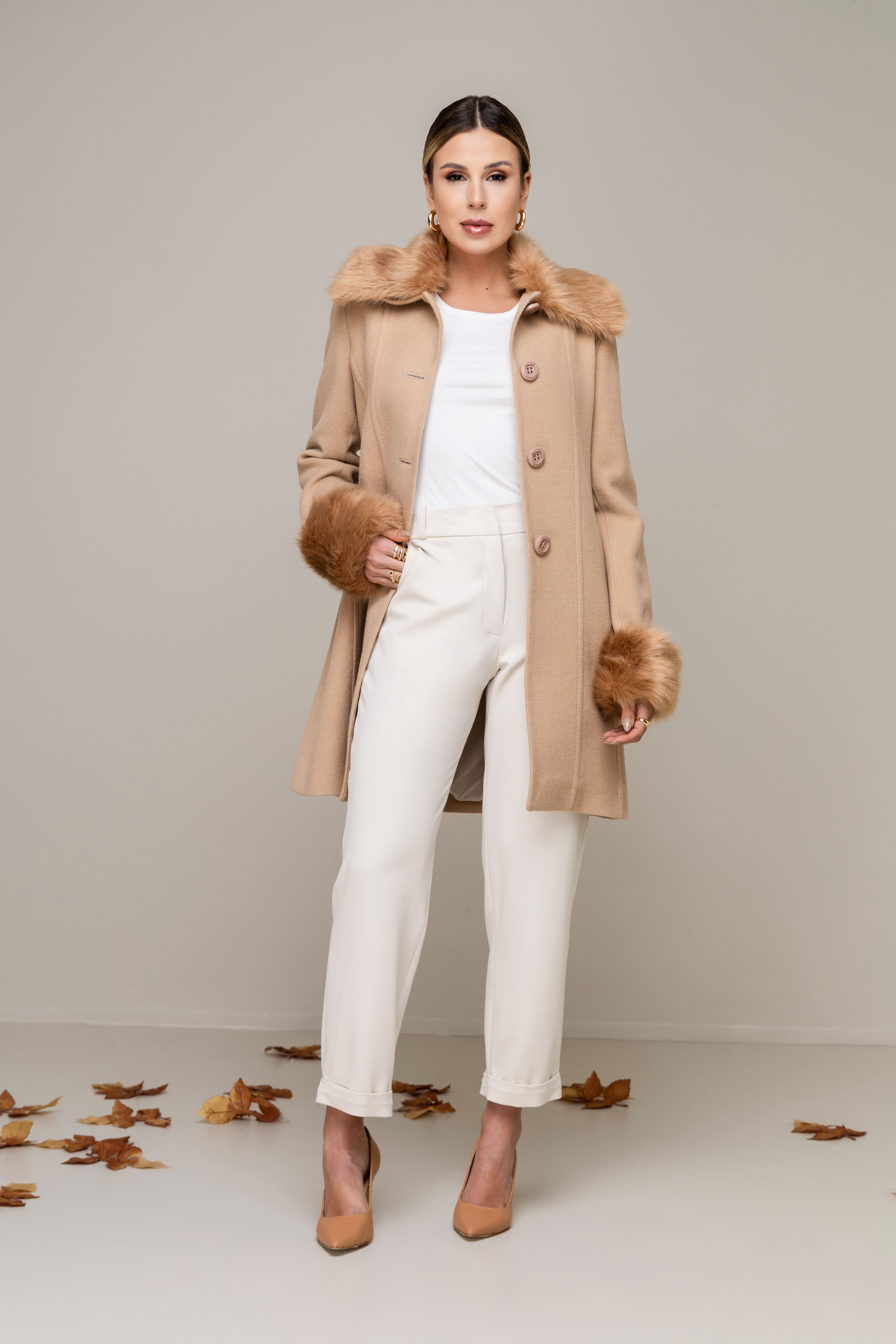 Casaco 7/8 em lã forrada, com gola e punhos em pele sintética removível. Os recortes verticais com pespontos delicados alongam o visual e destacam o acabamento impecável. Fechamento frontal por botões.
