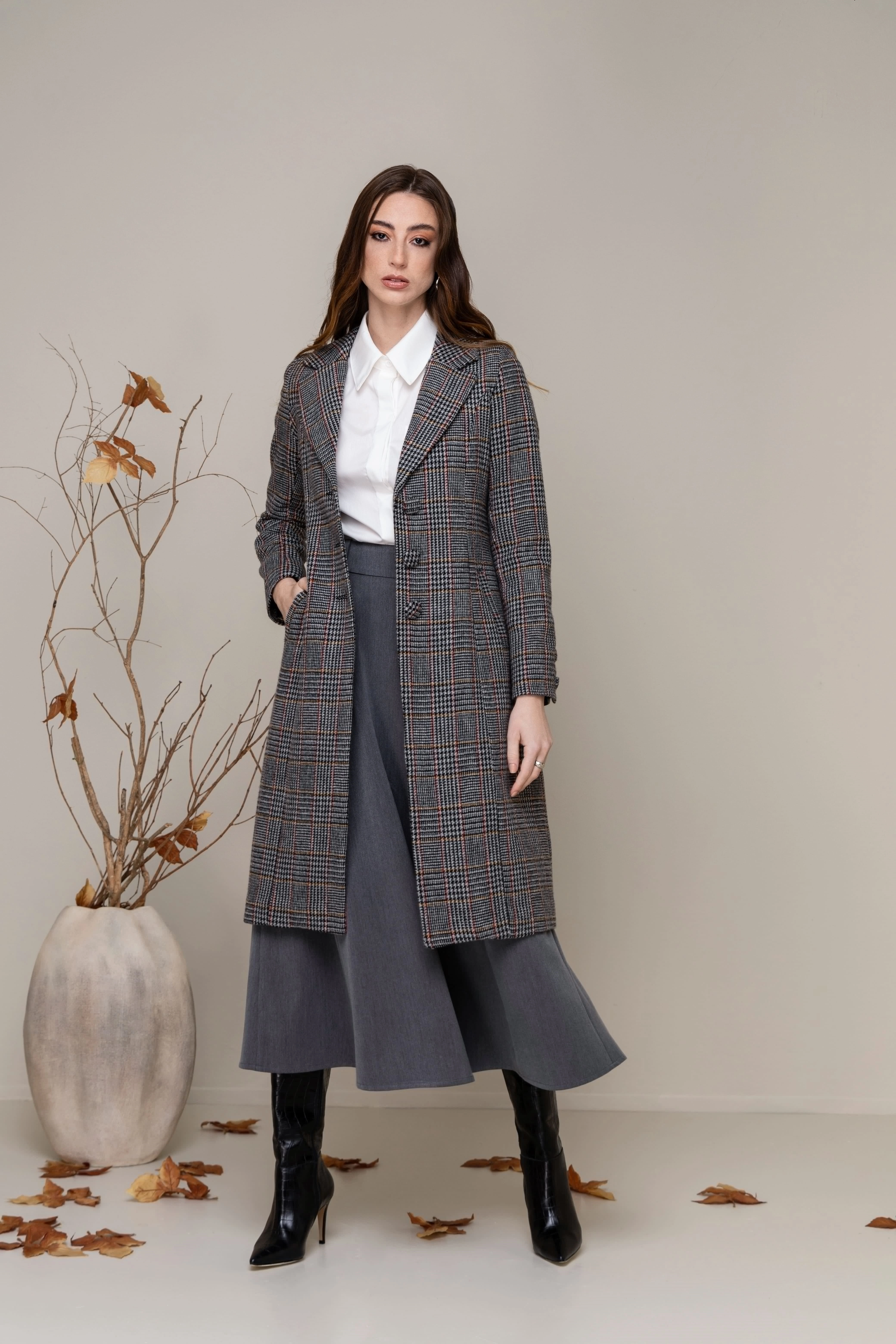 Blazer 7/8 em lã xadrez forrada, com gola alfaiate e fechamento frontal e nos punhos por botões forrados do próprio tecido. Possui bolsos de vivo diagonais que oferecem conforto e complementam o design clássico com sofisticação.