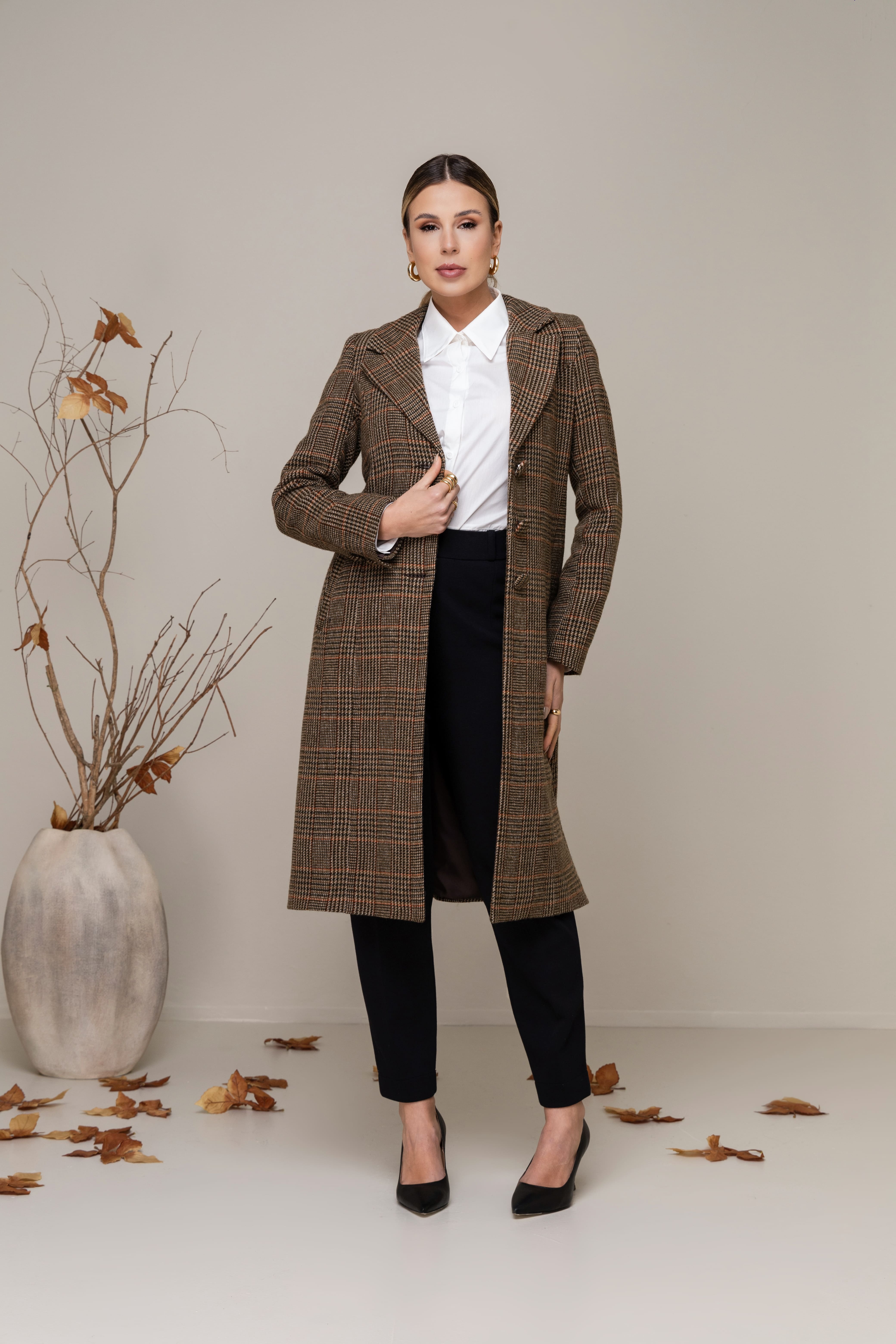As linhas alongadas e a construção impecável reforçam o caráter atemporal da peça. Uma alfaiataria que respira leveza e traduz o equilíbrio entre força e delicadeza.