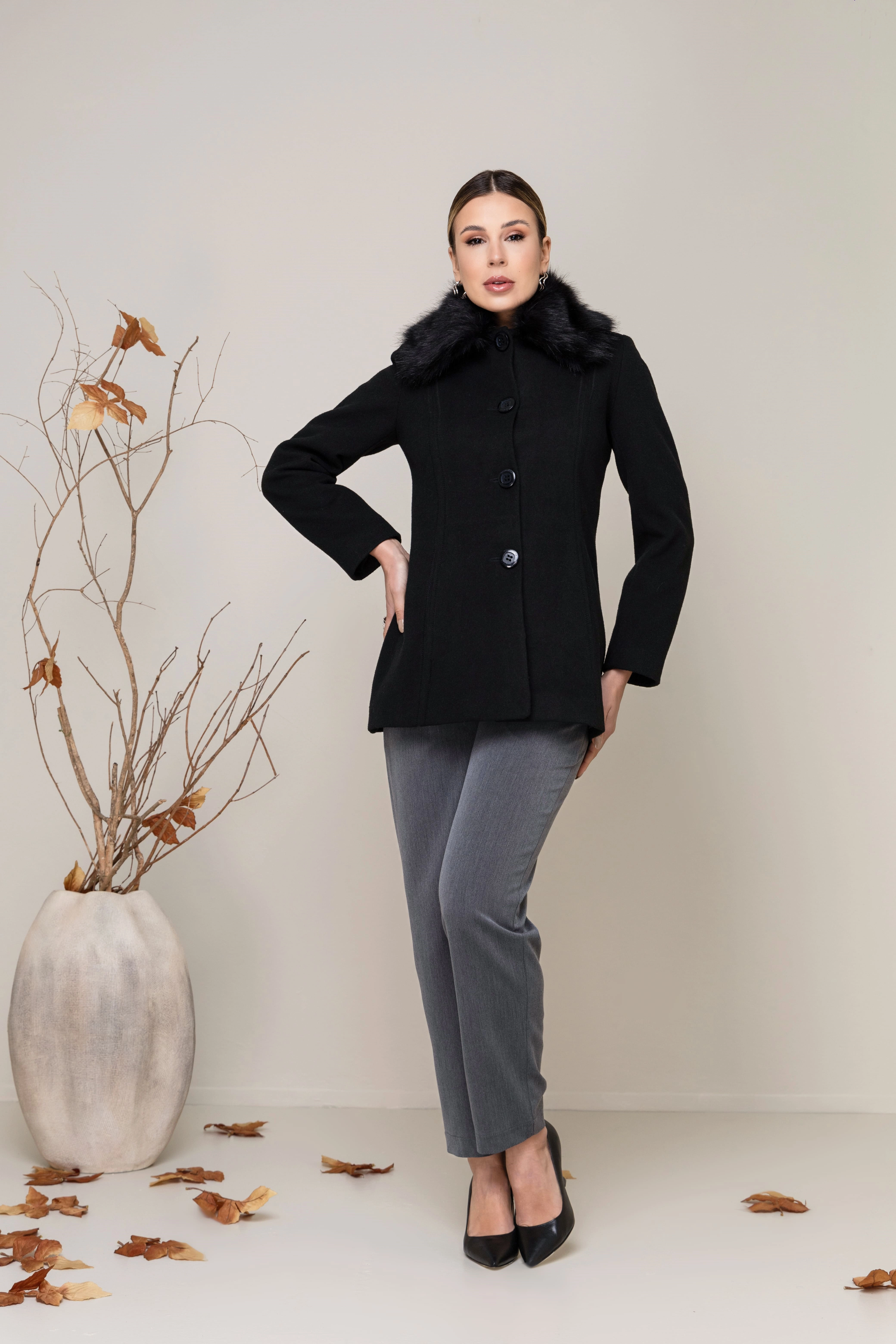 Casaco 3/4 em tecido sintético forrado, com gola em pele sintética removível. Possui recortes com pespontos em zigue-zague que enriquecem o design, bolsos nos recortes e fechamento frontal por botões.