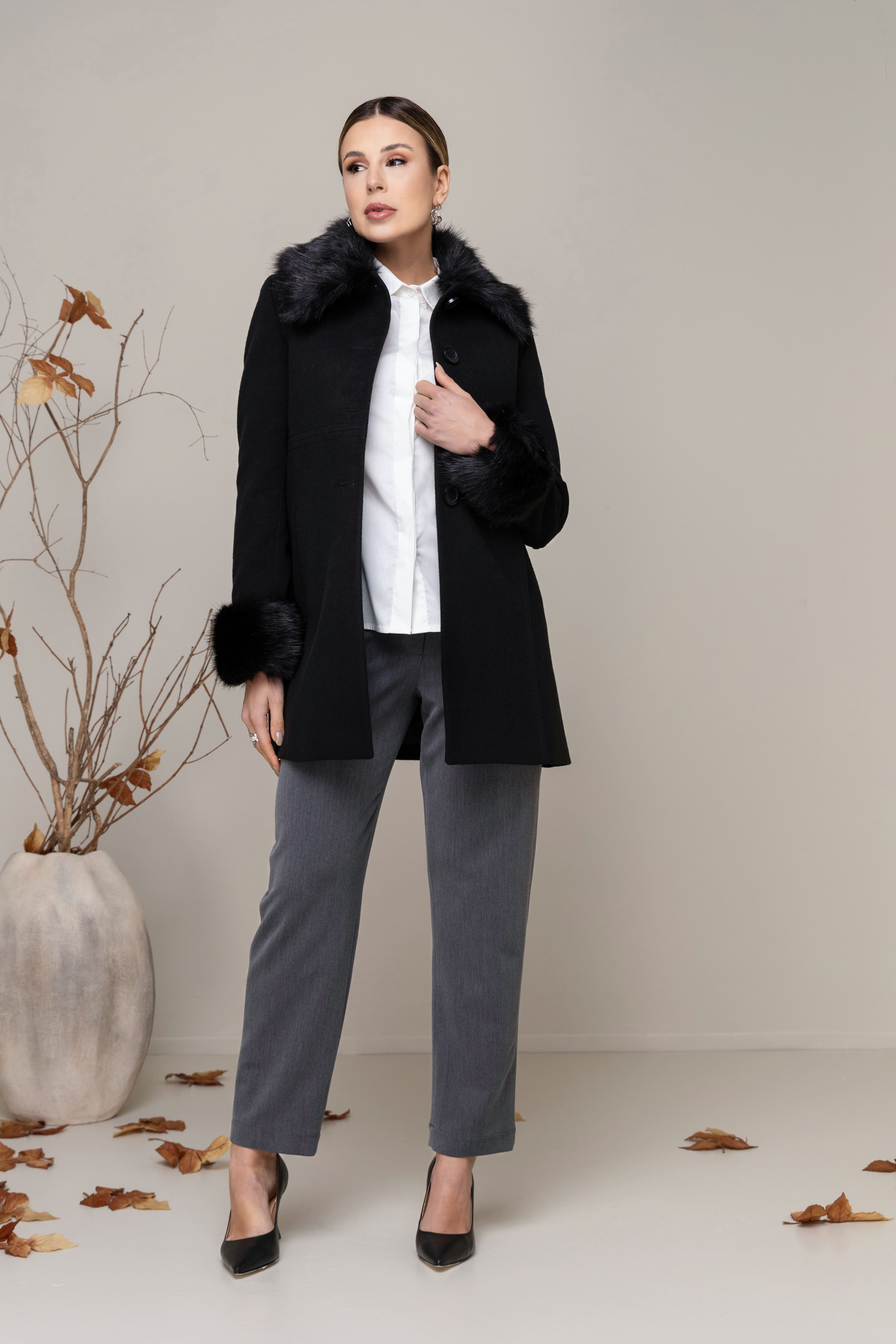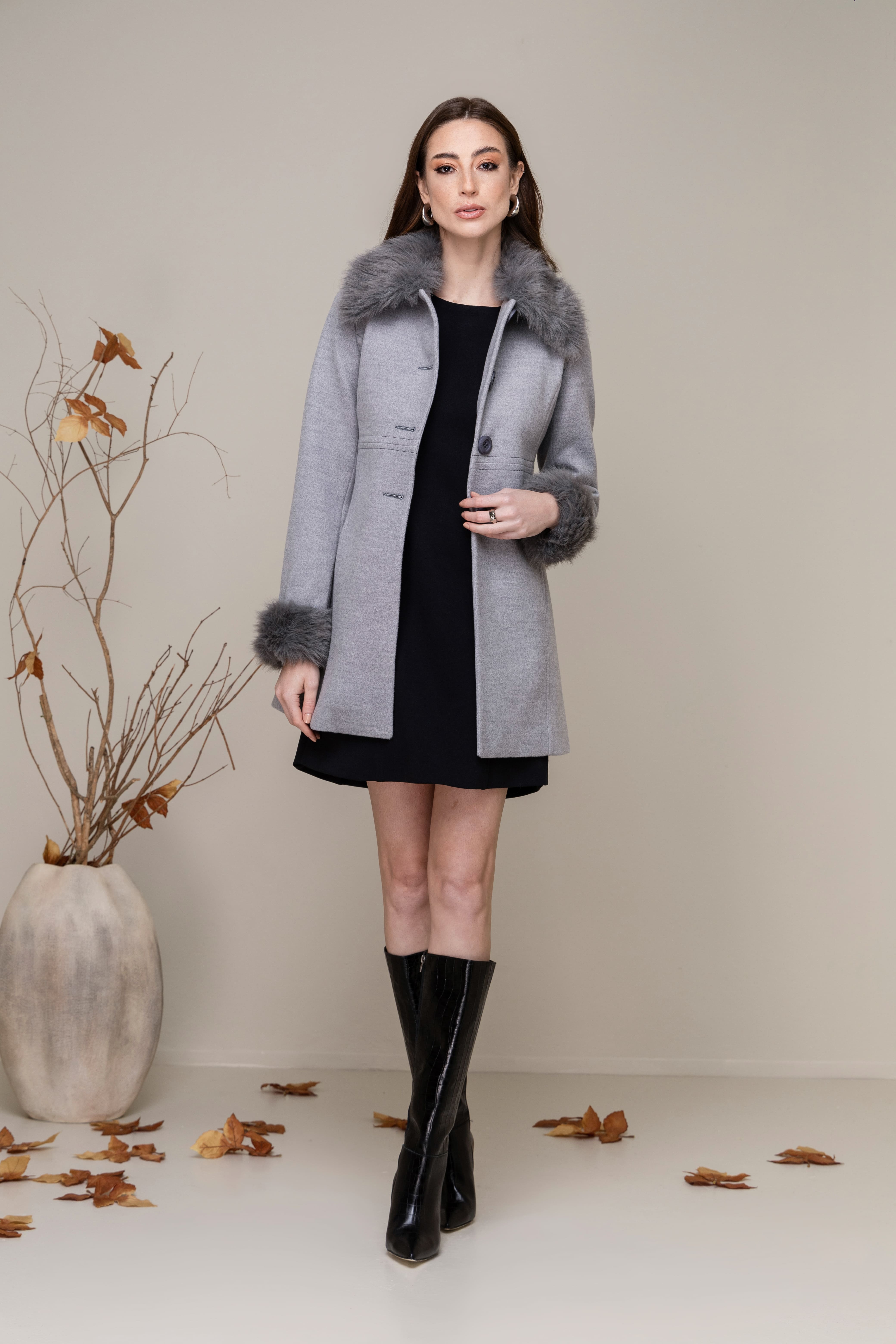 Casaco 7/8 em tecido sintético forrado, com gola e punhos em pele sintética removível. Possui recortes princesa com pespontos delicados, bolsos embutidos nos recortes e fechamento frontal por botões.