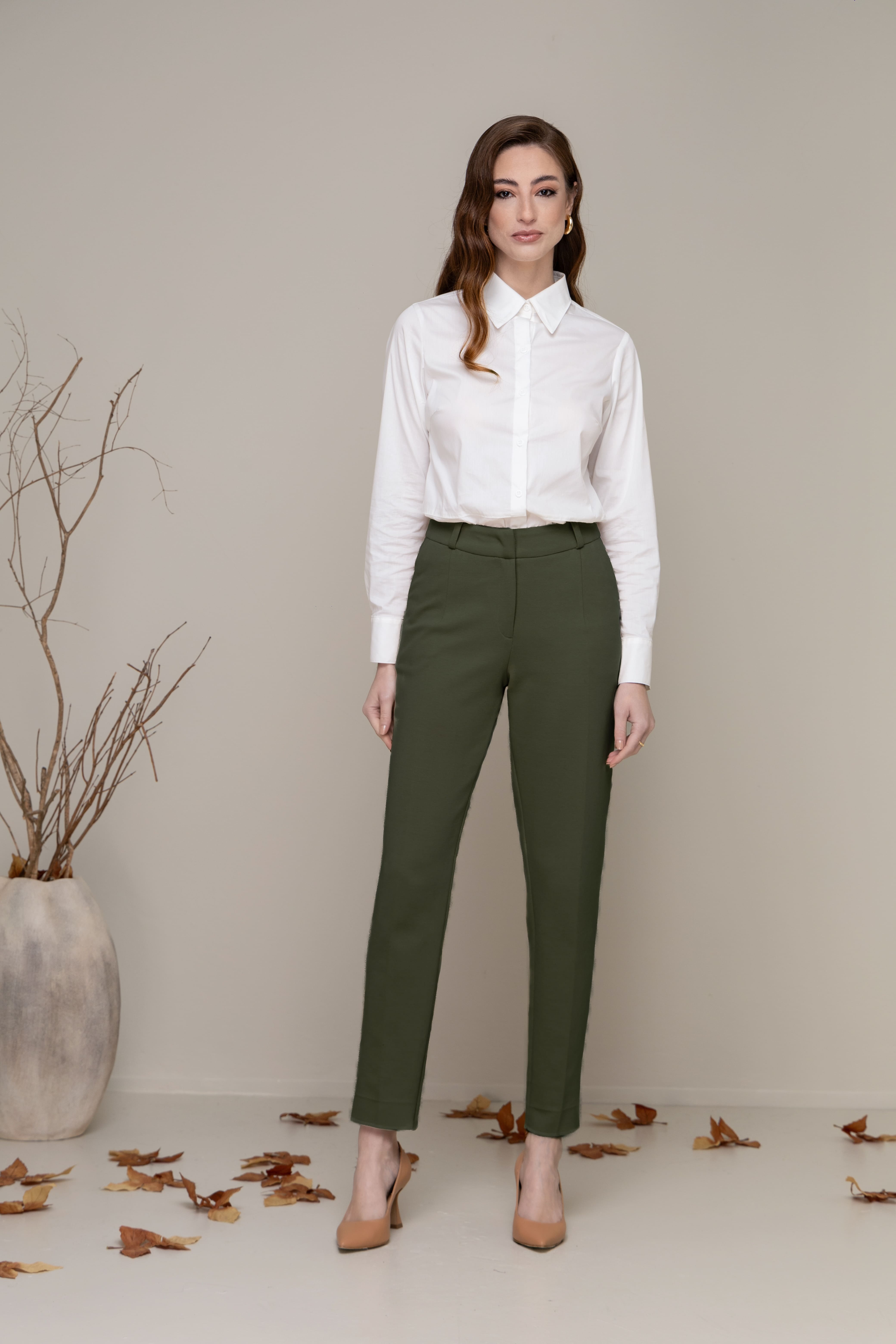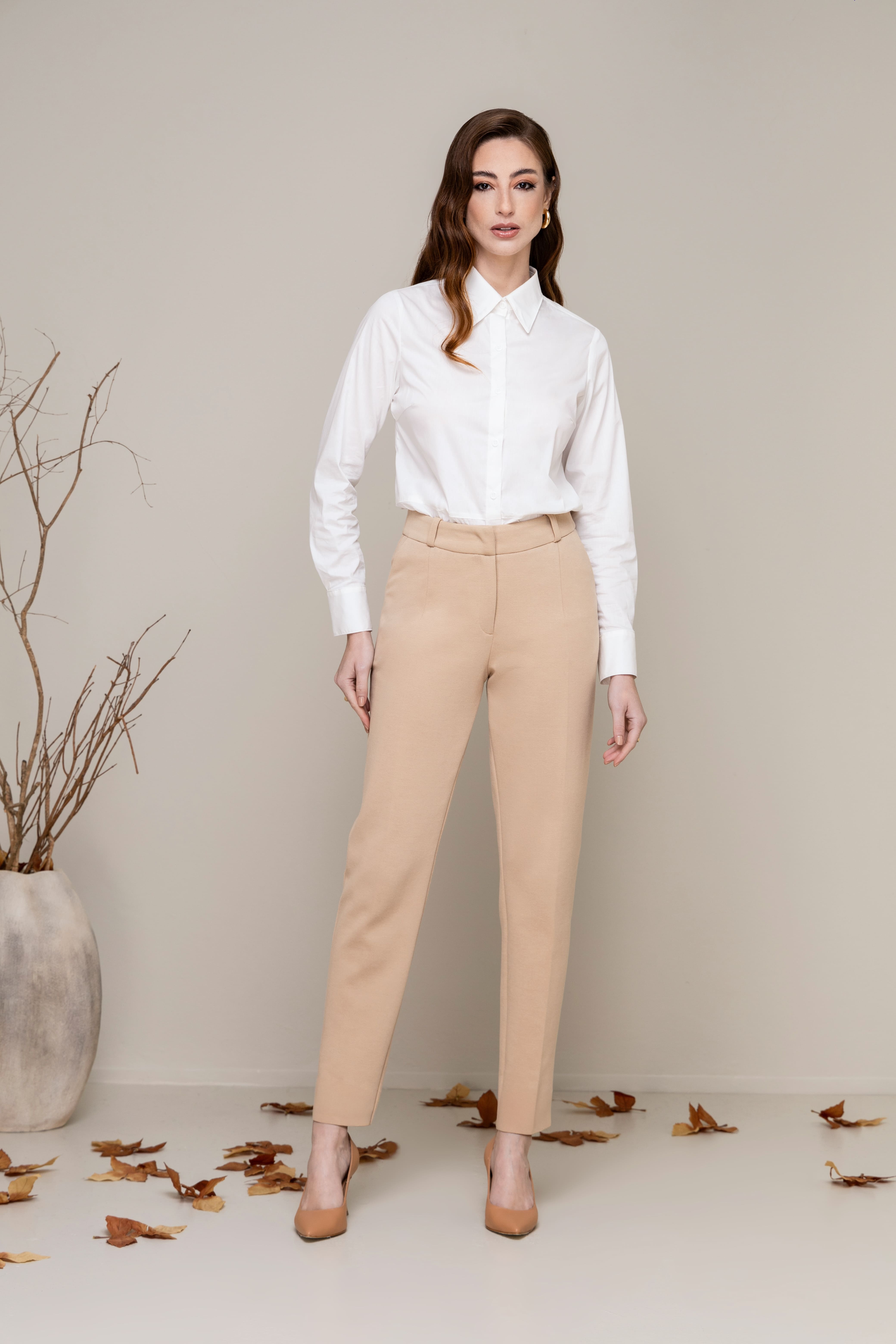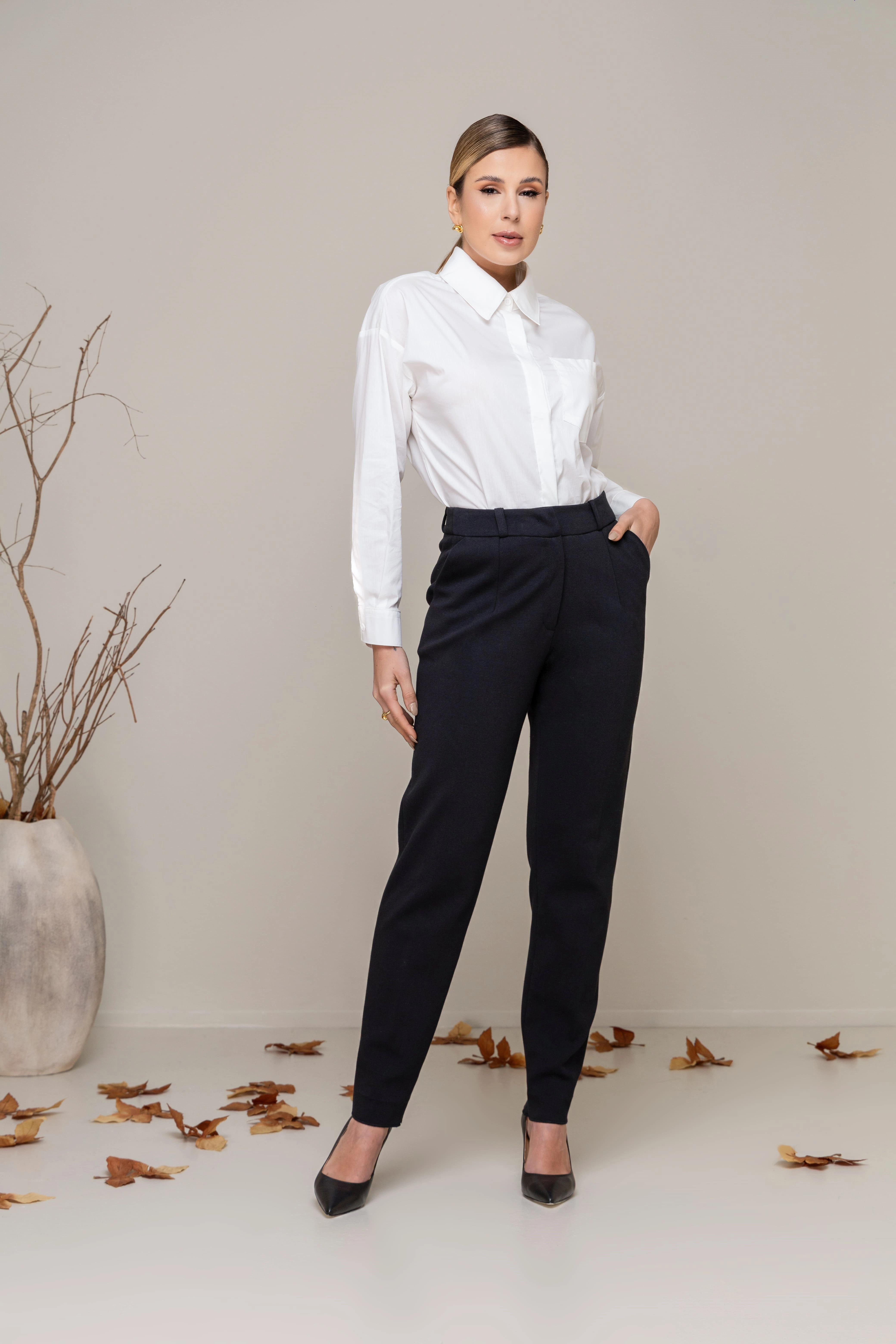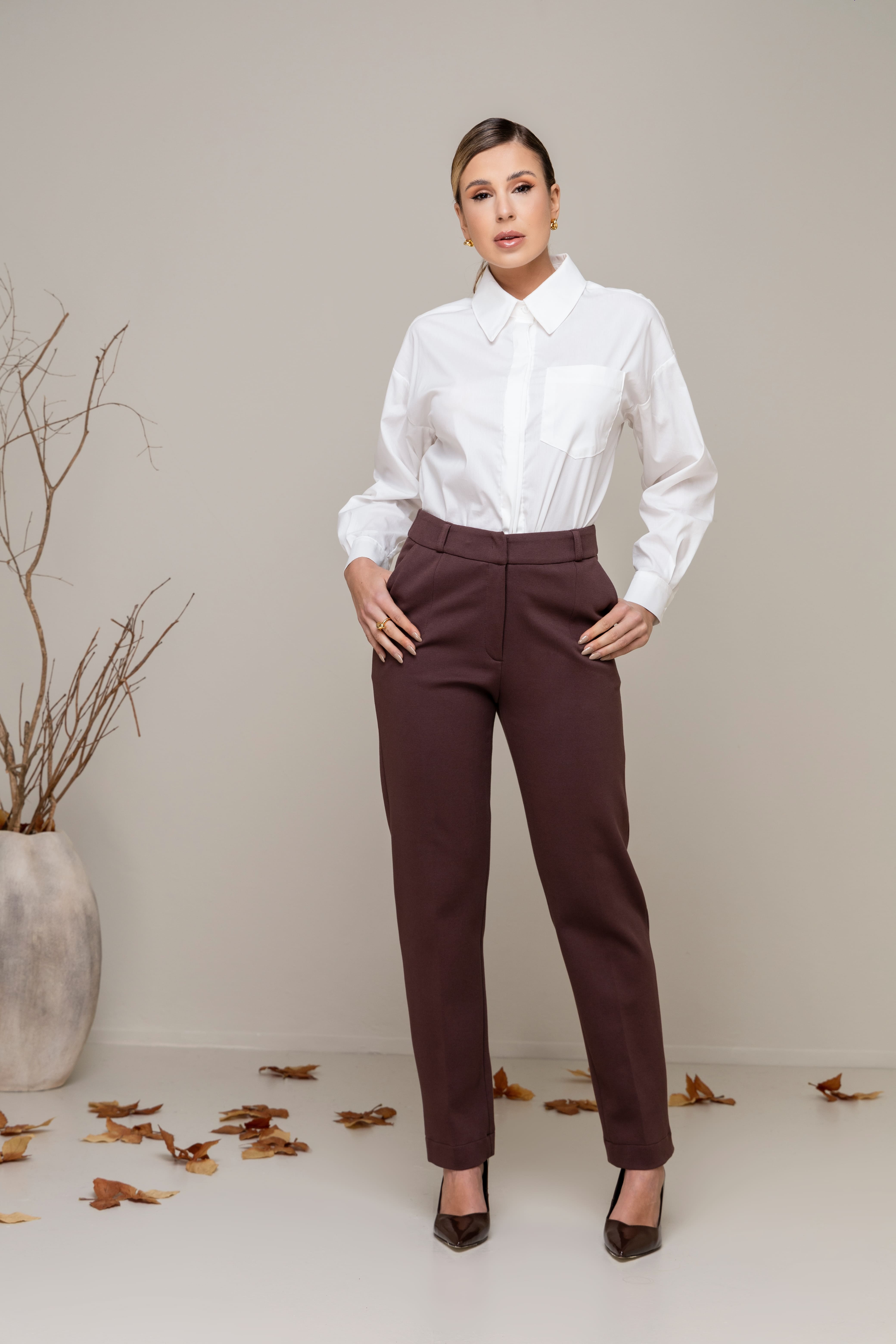 Calça reta em malha double, com vinco frontal clássico da alfaiataria e fechamento interno, que mantém a estética minimalista e sofisticada da peça.