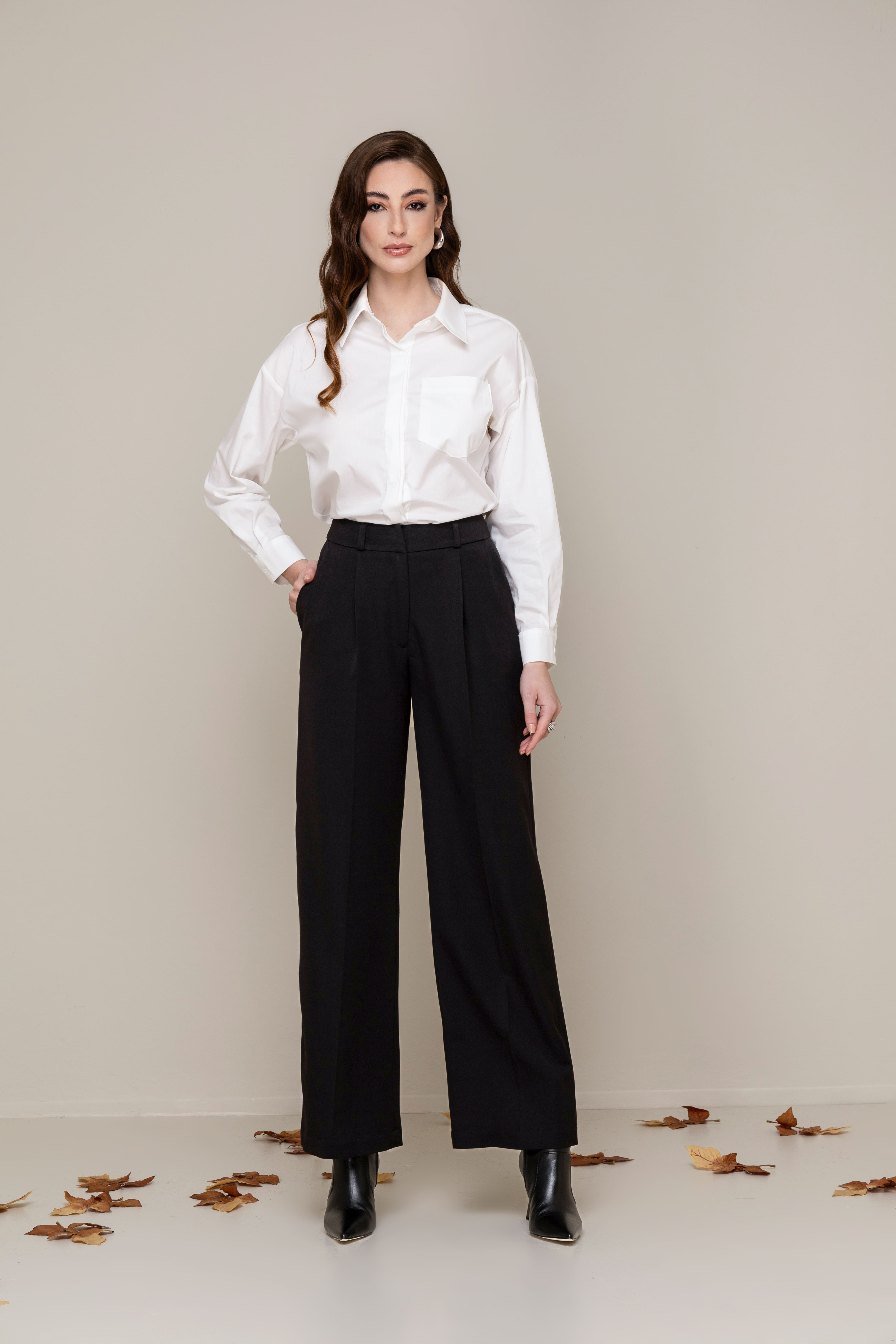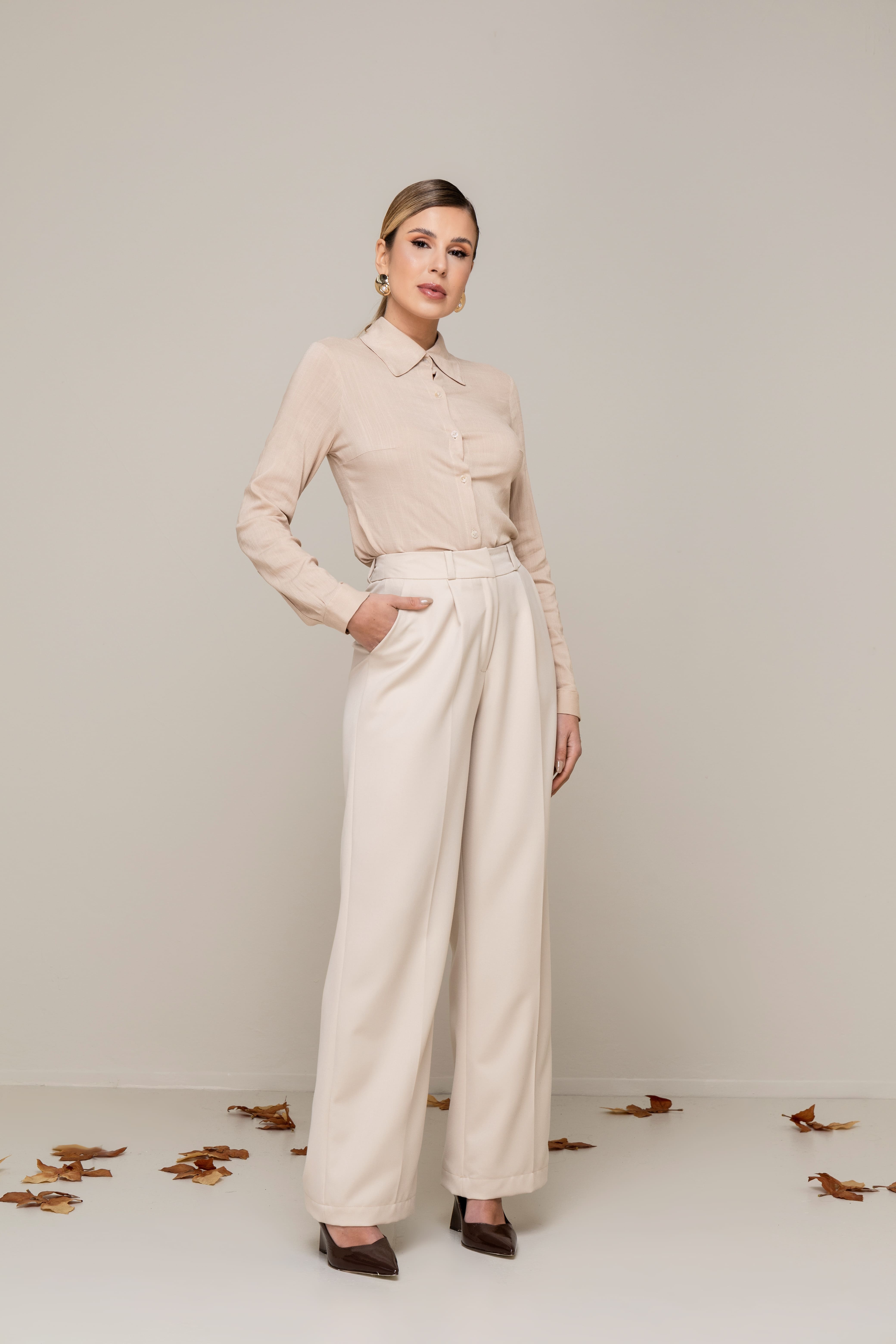 Calça reta em alfaiataria York, com modelagem clássica de corte limpo e caimento preciso. O vinco frontal e o fechamento interno reforçam sua construção minimalista e atemporal.
