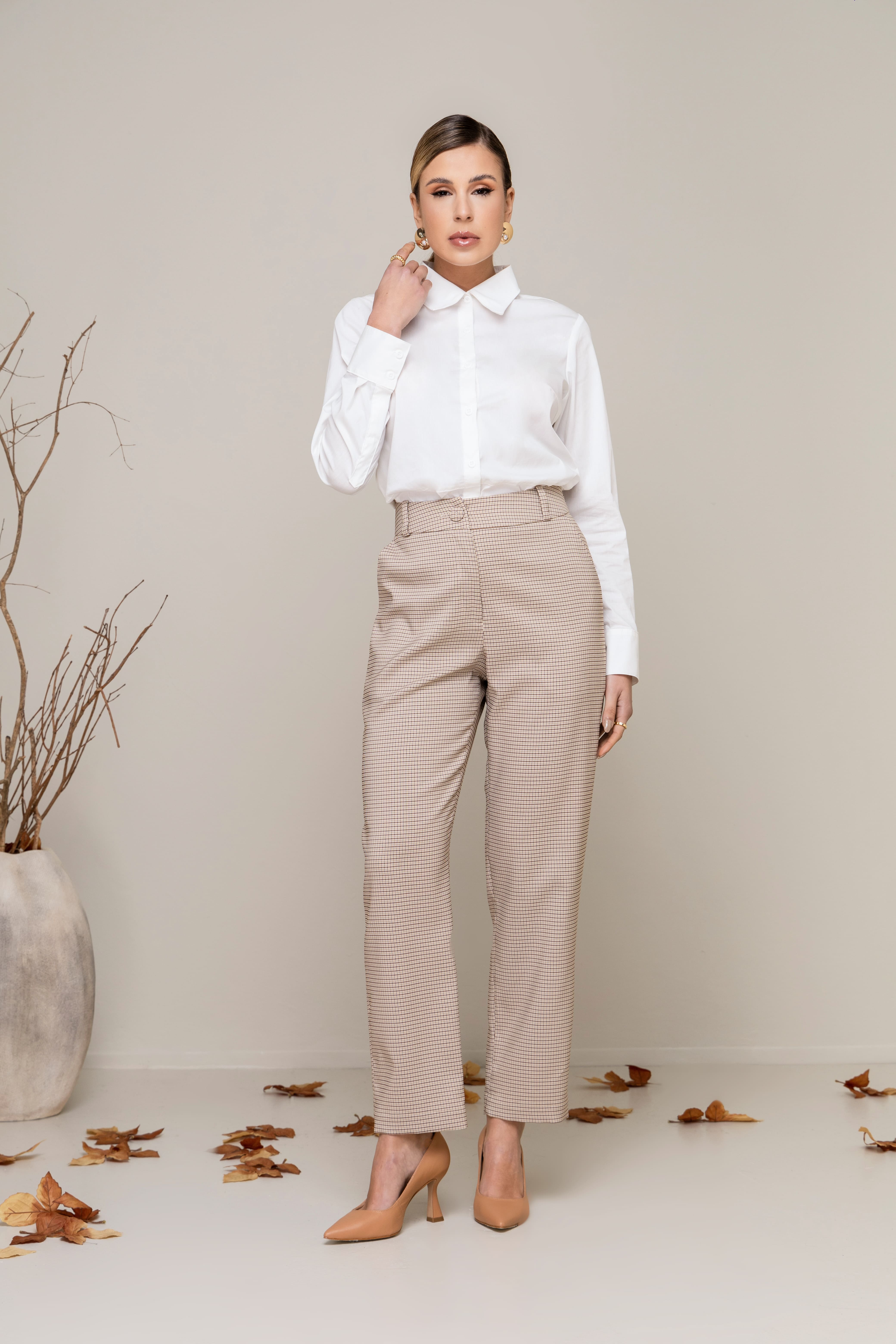 Calça reta em alfaiataria Veneza, de linhas limpas e corte preciso. A modelagem alonga a silhueta e valoriza o movimento natural do corpo, traduzindo a elegância atemporal da alfaiataria. Fechamento frontal por botão e zíper.