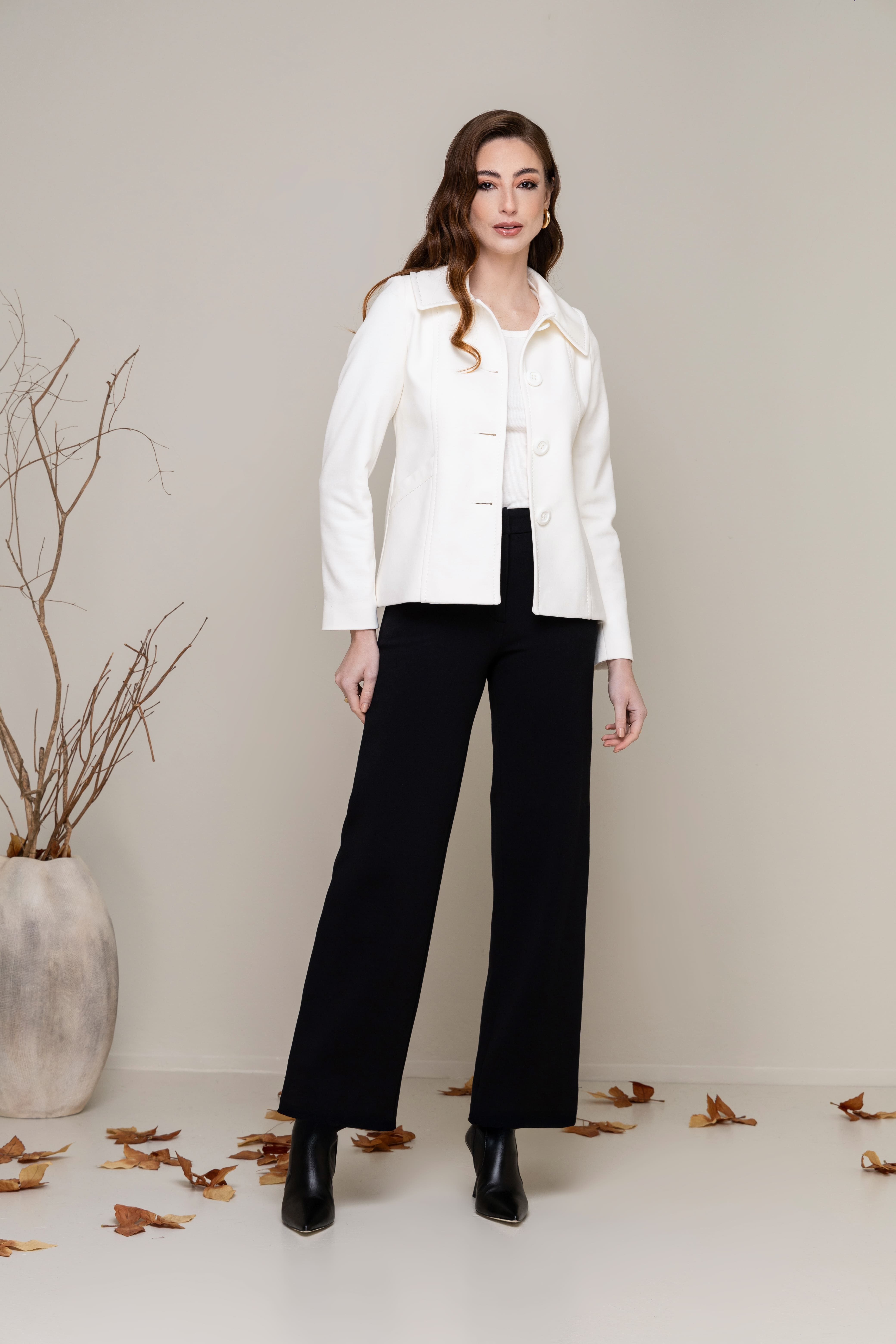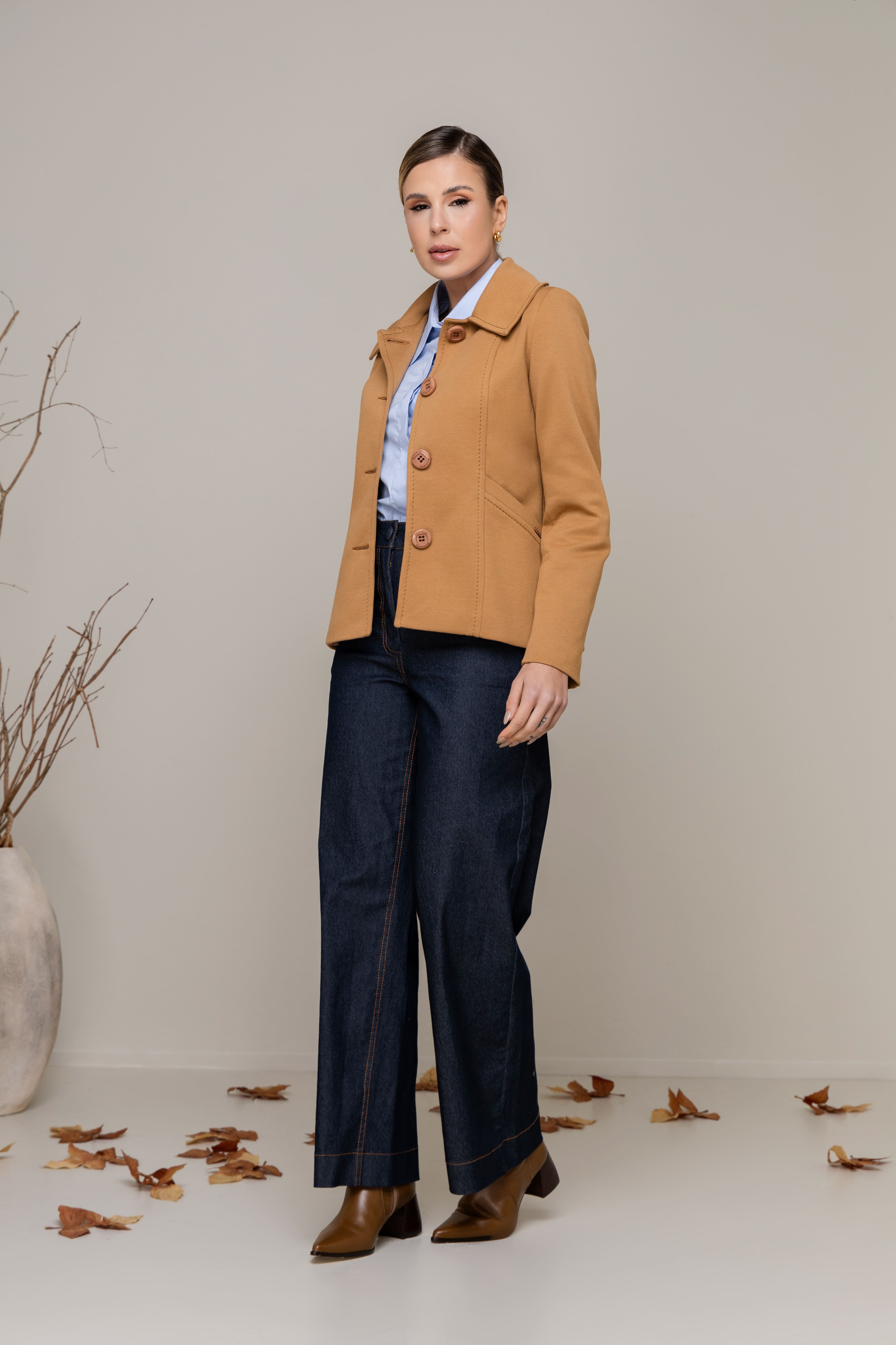 O design contemporâneo equilibra proporção e leveza, conferindo modernidade à alfaiataria clássica. Uma peça versátil e refinada, ideal para composições de elegância sutil.