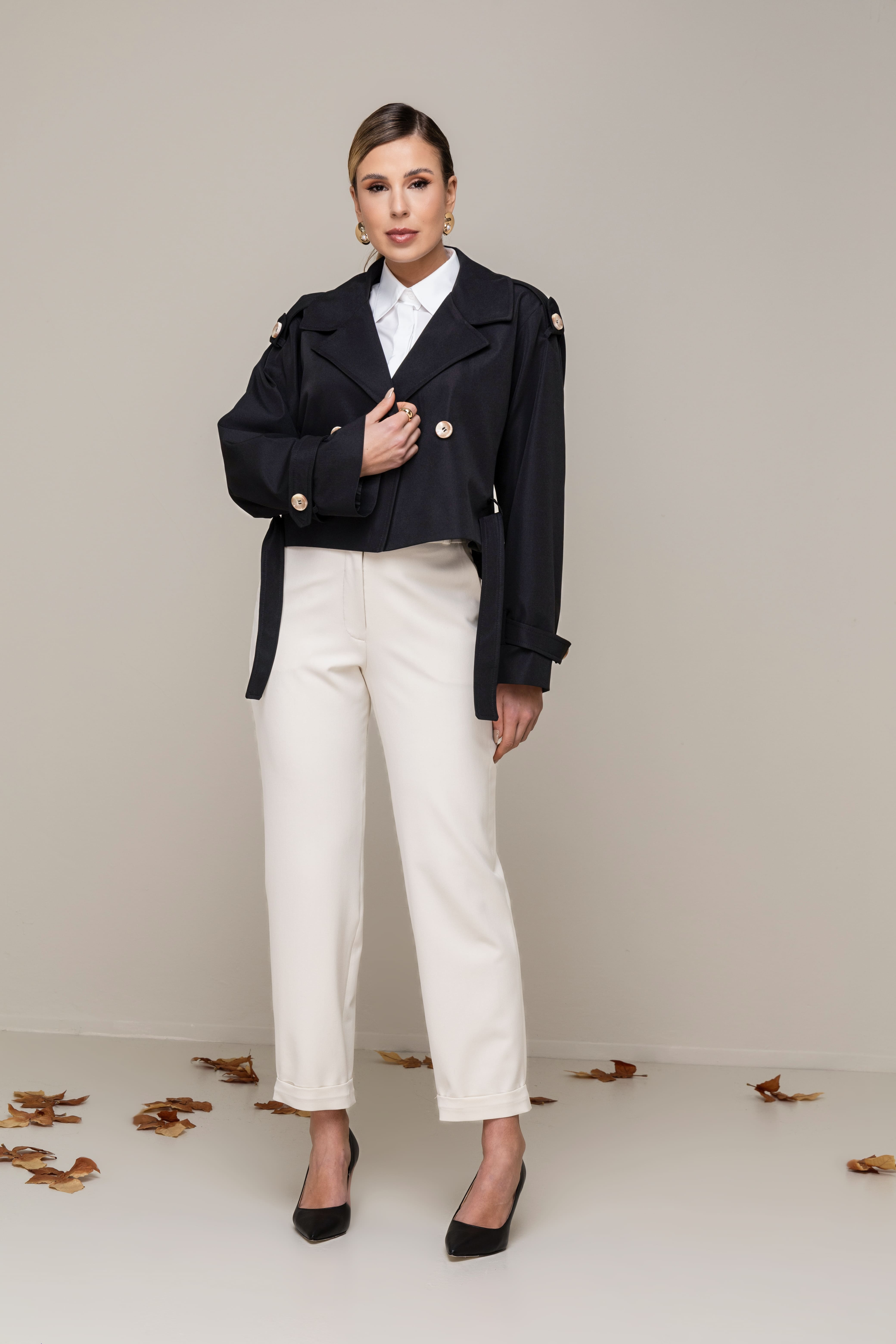 Trench coat cropped em alfaiataria Turim, com fechamento transpassado, cava deslocada e detalhes de ajuste nos punhos e ombros. A silhueta encurtada traz leveza e modernidade à alfaiataria clássica. Fechamento frontal por botões.
