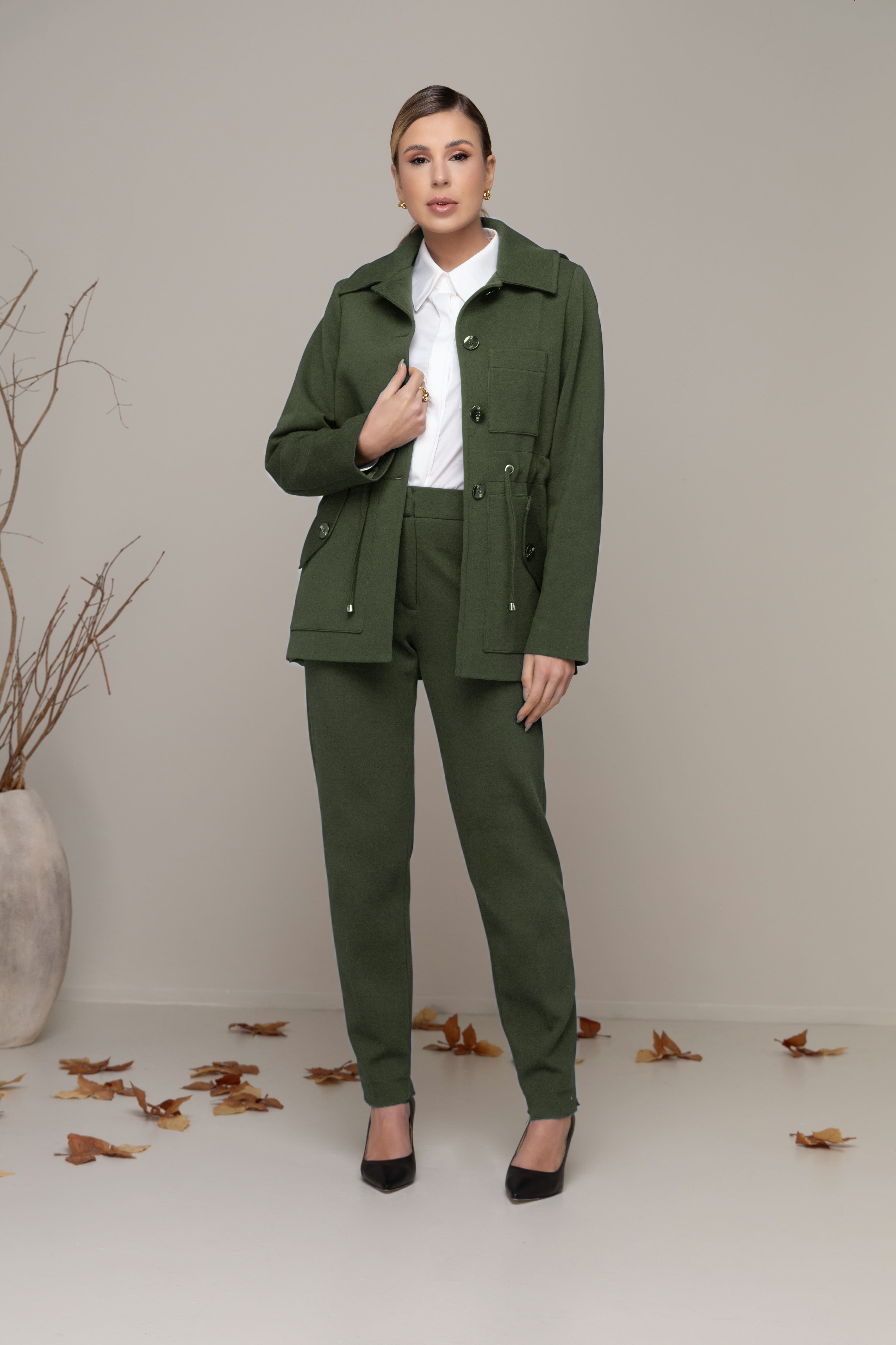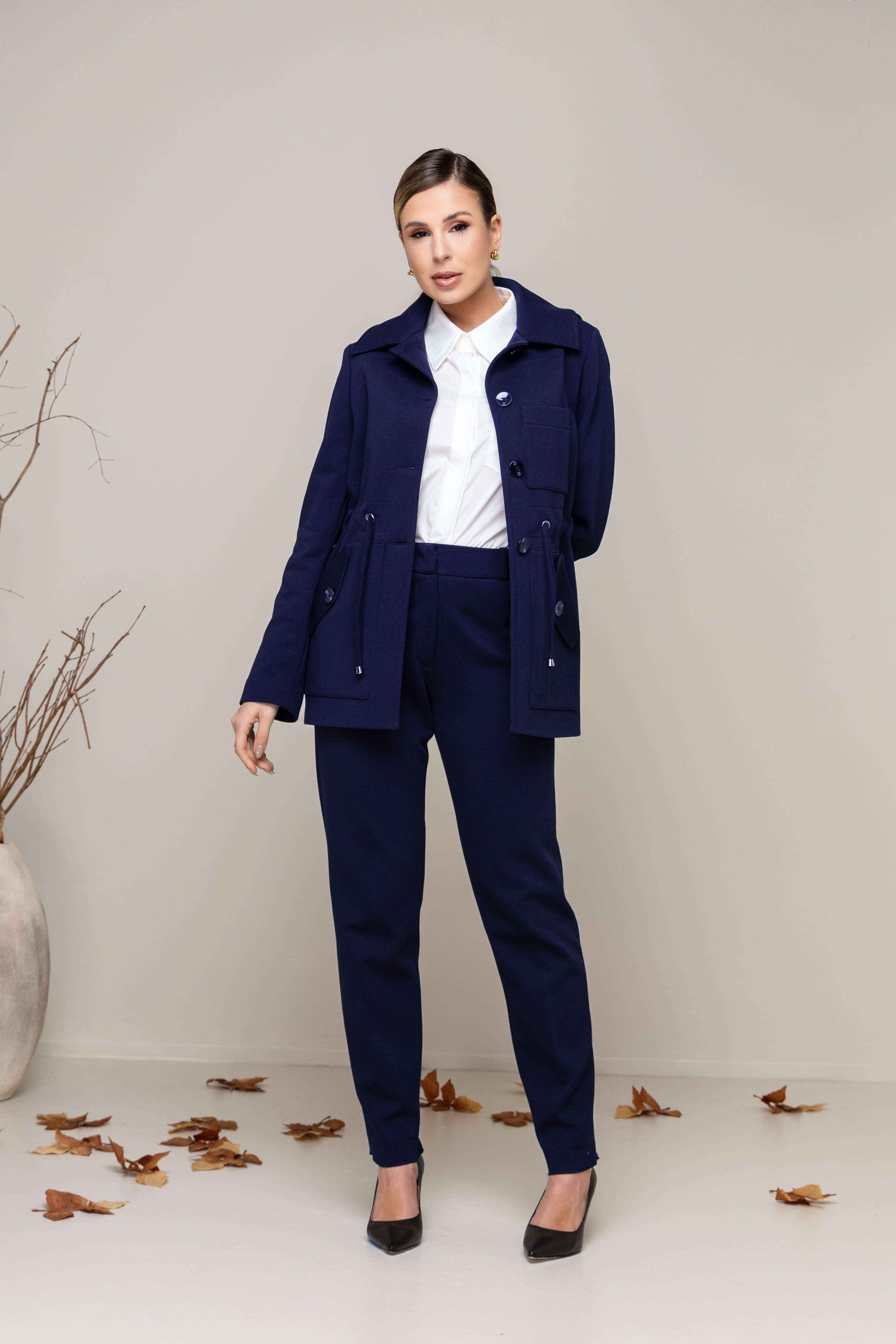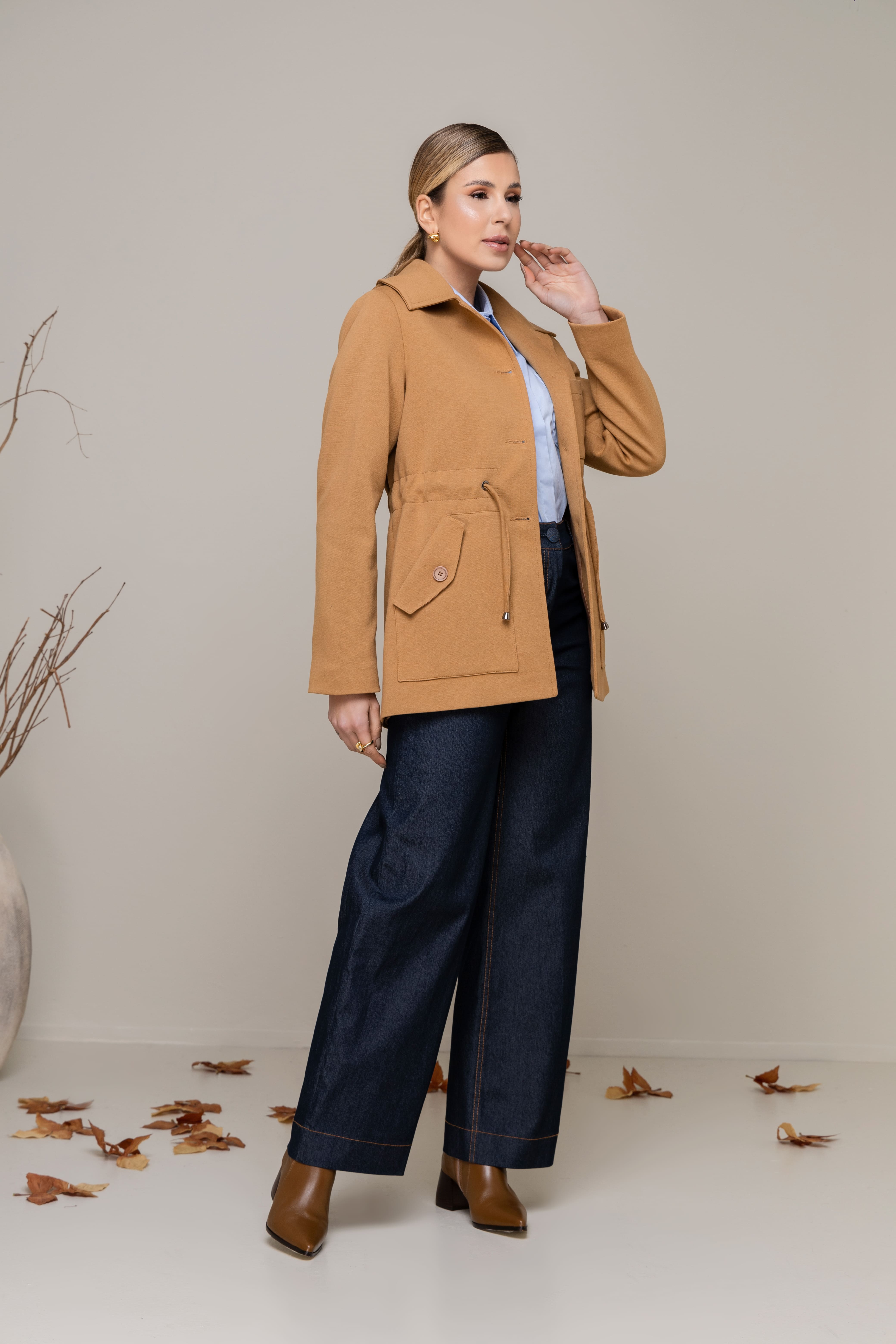 Parka 3/4 em malha double, com capuz removível por zíper. A modelagem une funcionalidade e sofisticação, com bolsos utilitários e cordão para acinturar do próprio tecido. Fechamento frontal por botões.