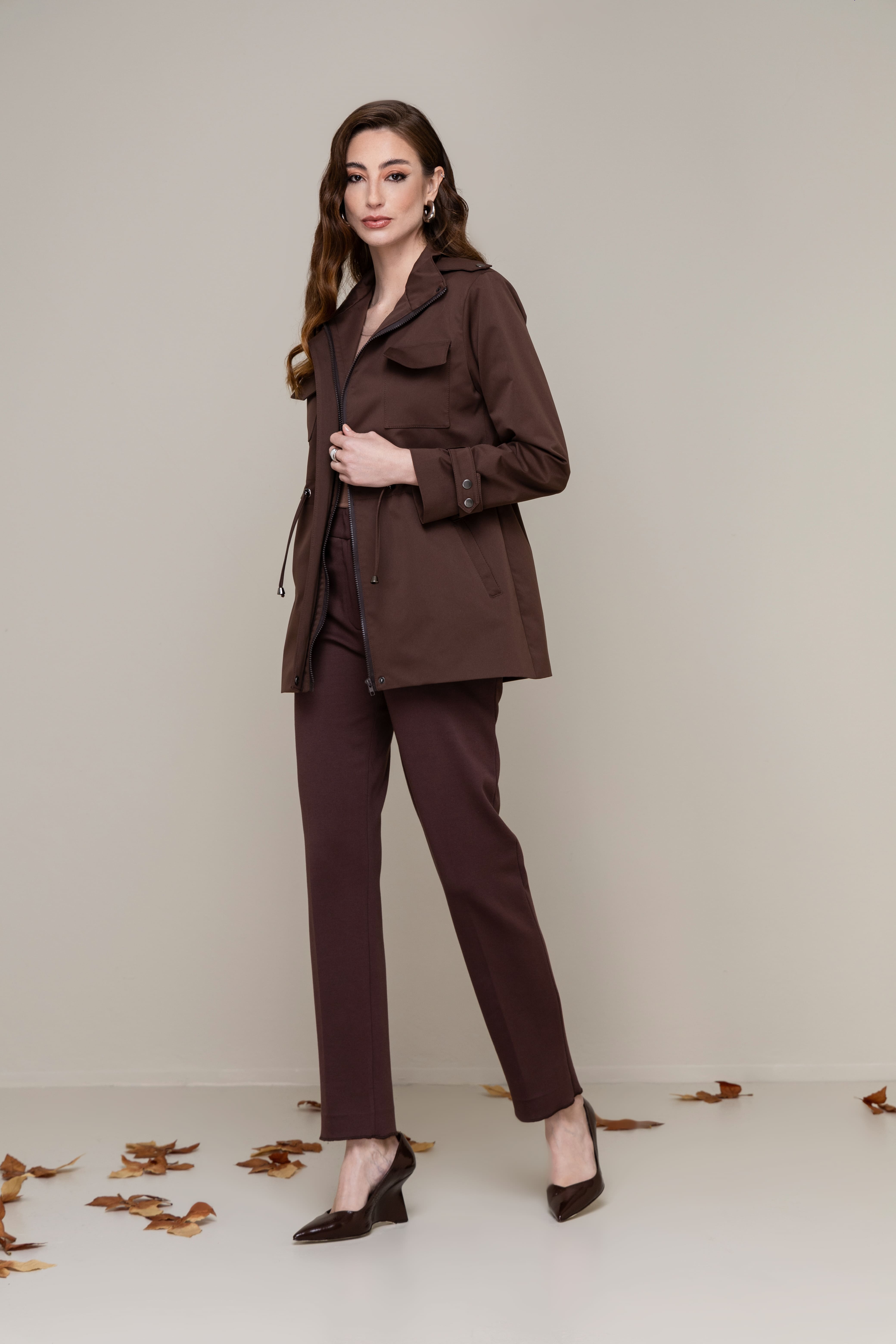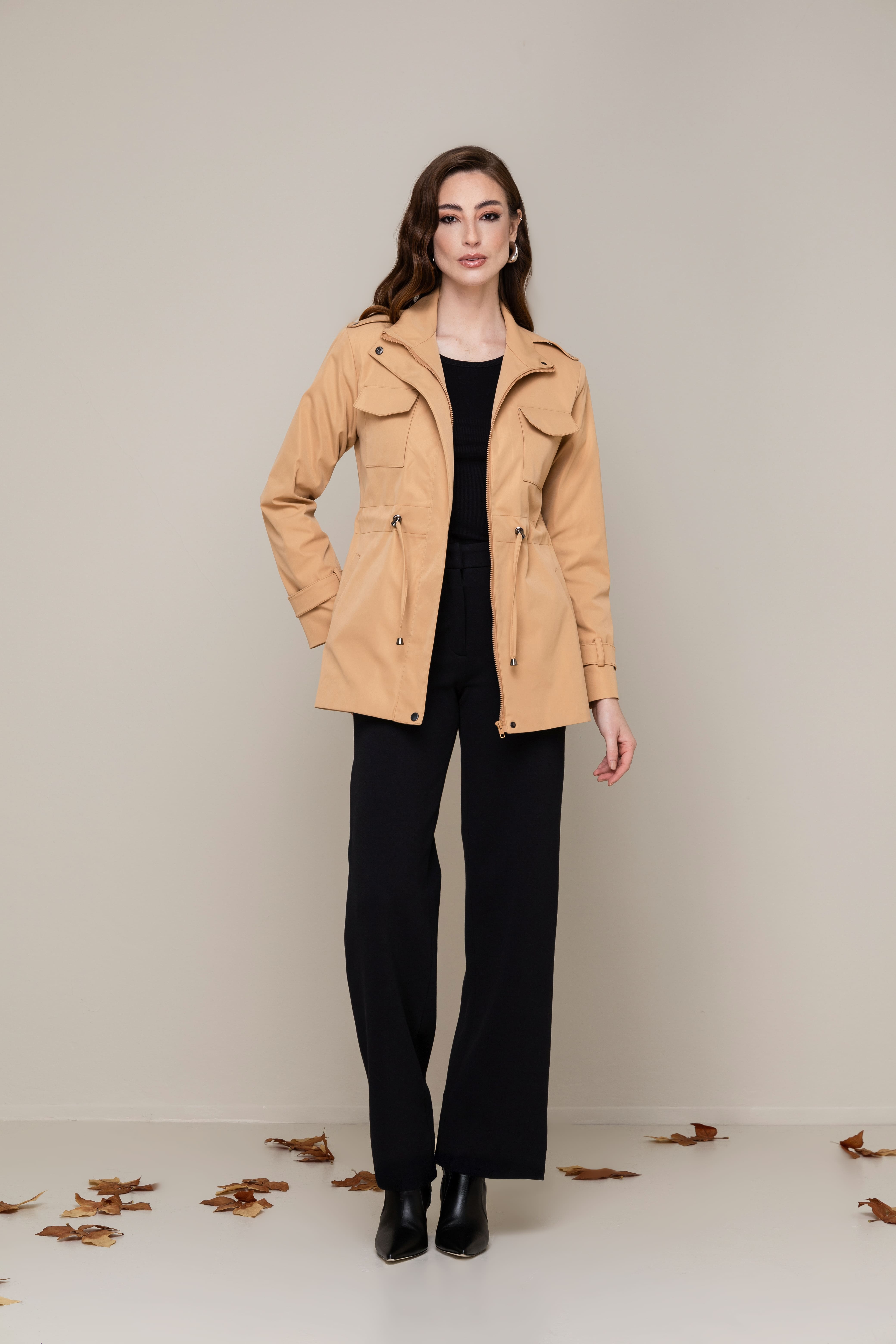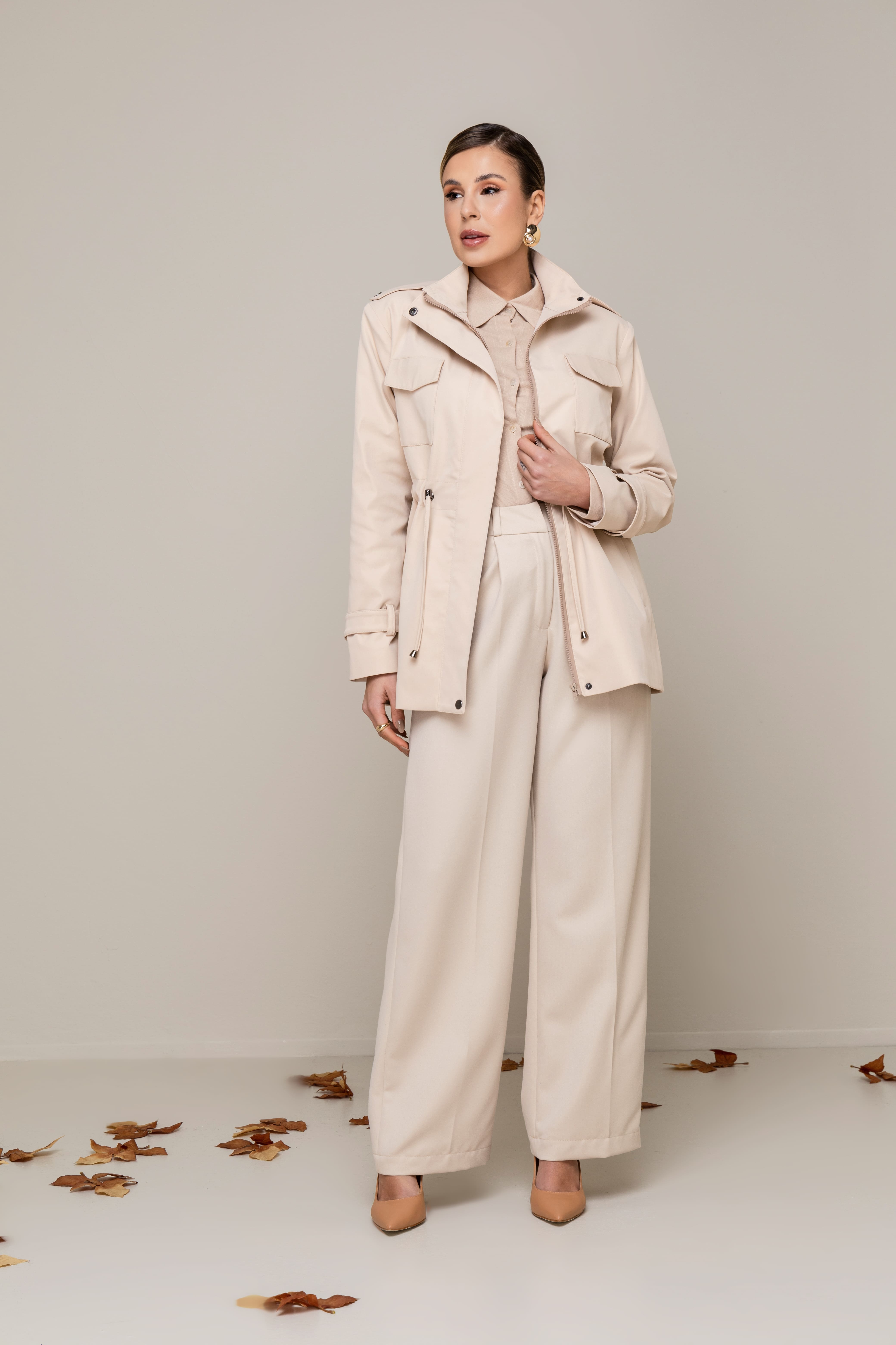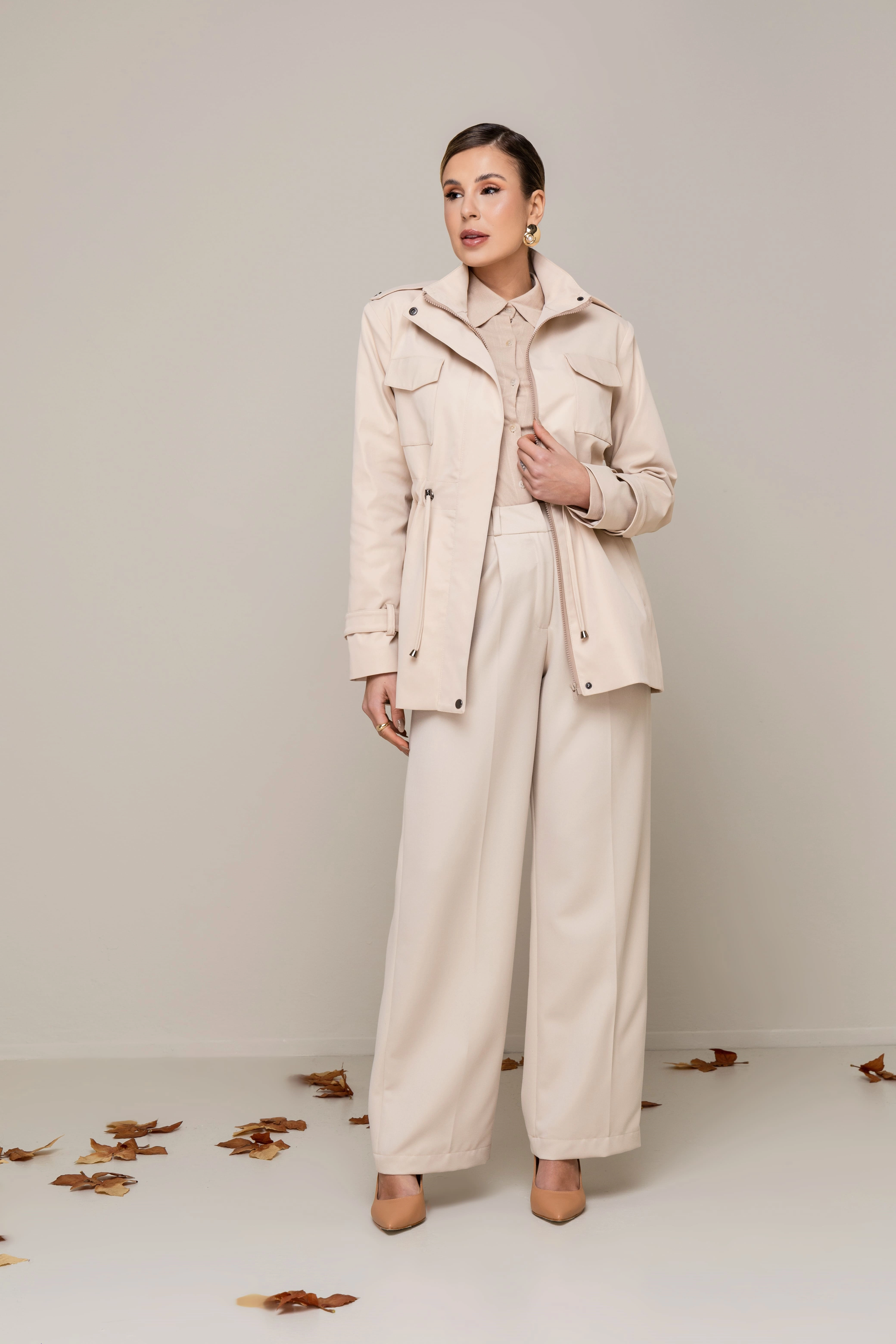Parka 3/4 em alfaiataria Turim, com inspiração militar e cintura ajustável por cordão do próprio tecido. Fechamento frontal por zíper de metal oculto por lapela. Possui bolsos utilitários, cava levemente deslocada e detalhes nos ombros e punhos.