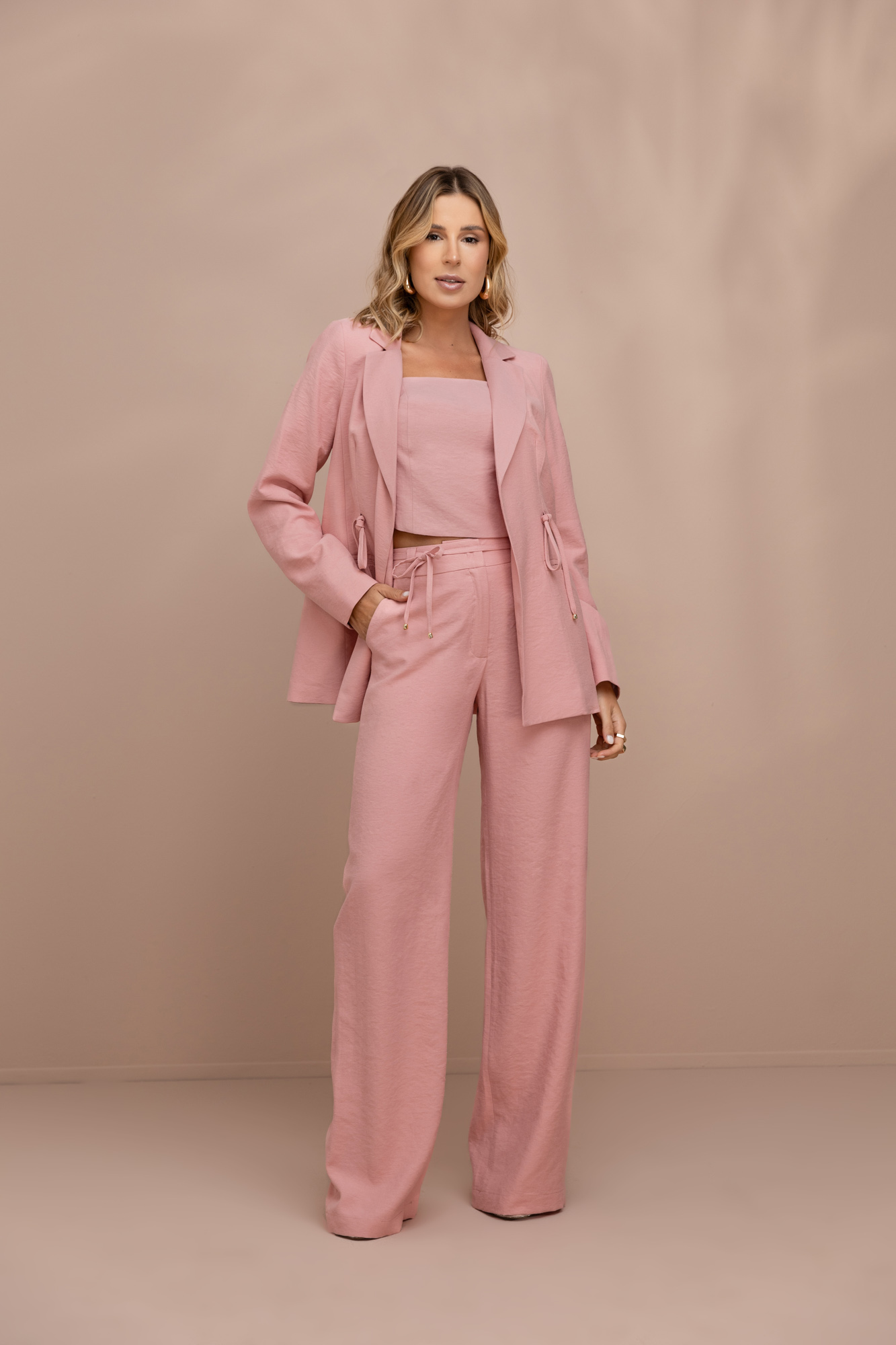 Blazer forrado em alfaiataria Paris, modelagem ampla com amarração de cordão do próprio tecido.