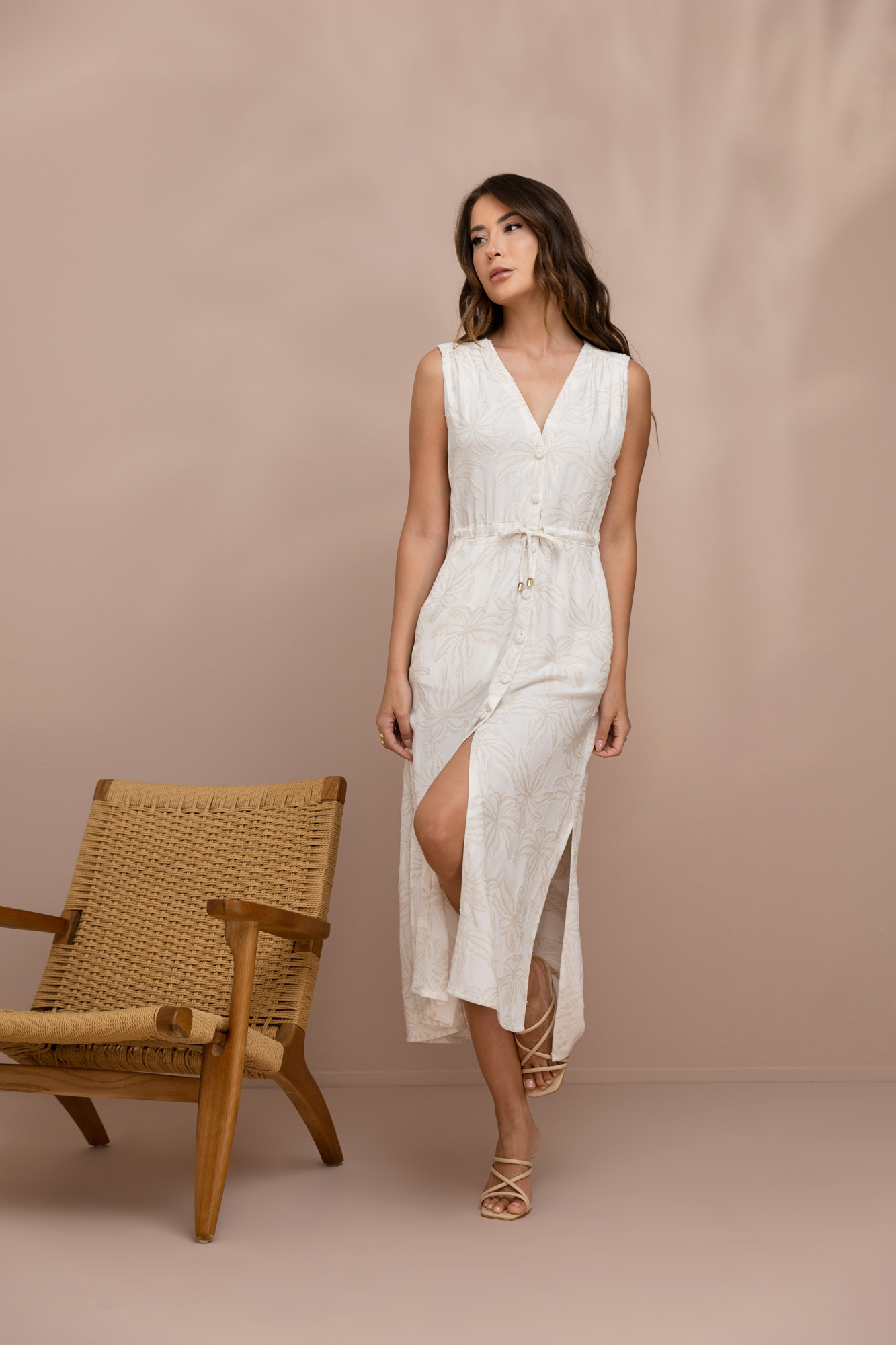 Vestido em viscose jacquard com modelagem ajustada. Decote V, detalhes franzidos nas palas, fendas laterais e cordão do próprio tecido. Fechamento por botões forrados.